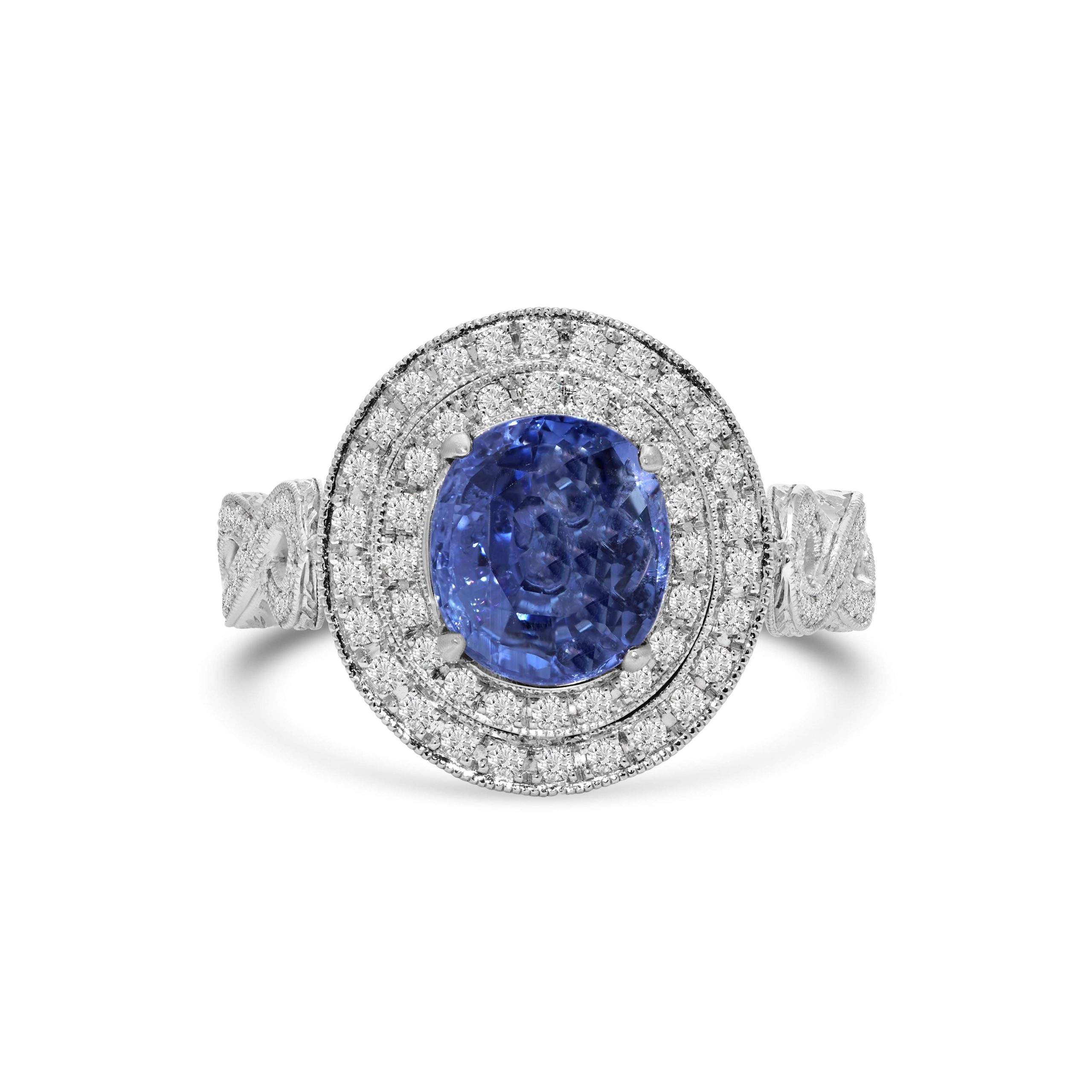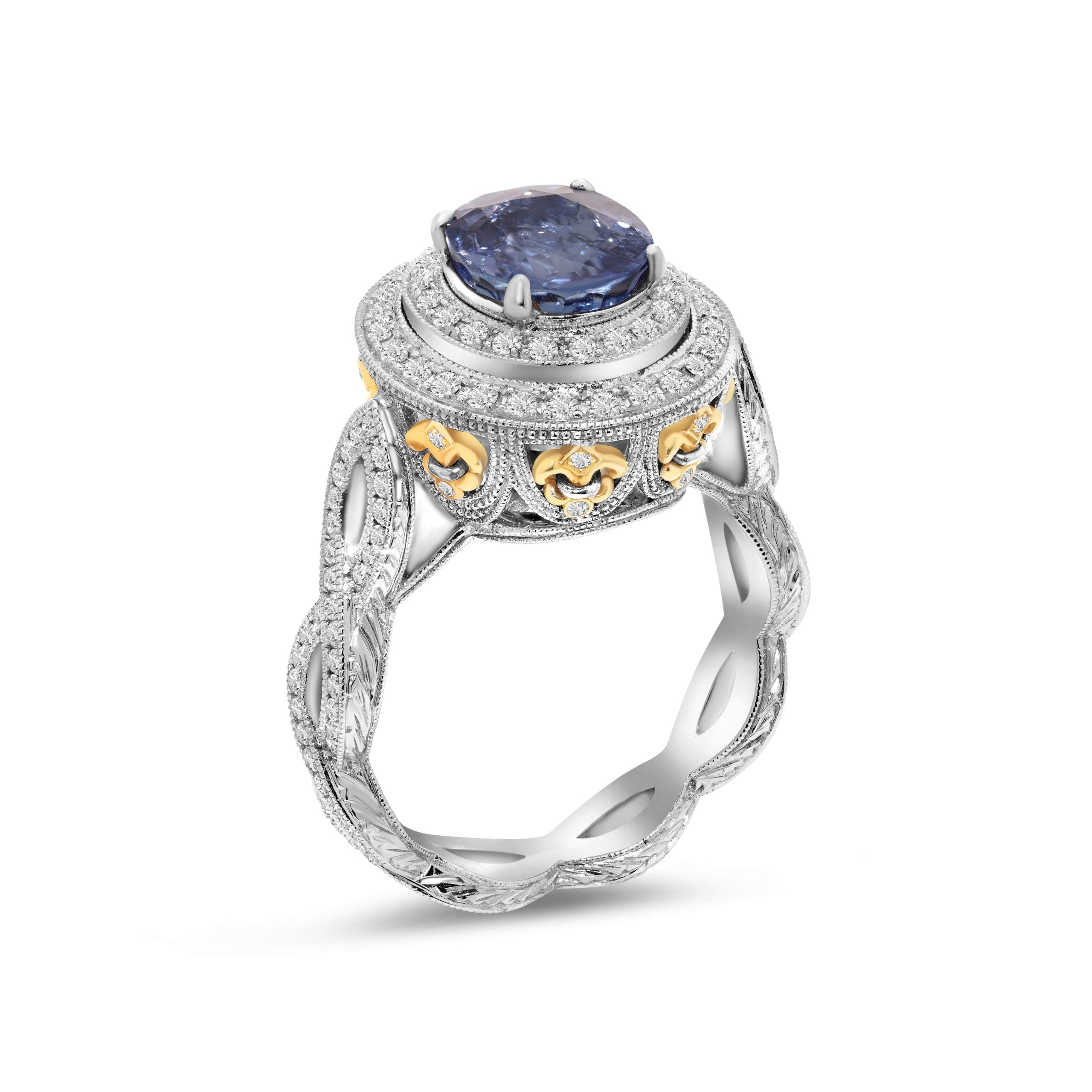 Indulge in luxurious sophistication with our 18 karat two tone double halo diamond ring, a striking marvel designed to captivate. At its core gleams a brilliant 2.85ct. oval blue sapphire, regally set in the center and embraced by .80cts. of round brilliant cut diamonds in a magnificent double halo. The shank boasts an intricately twisted design, exuding elegance and modernity. Adding a touch of intricate beauty, the side gallery features exquisite yellow gold filigree work, showcasing the artistry of craftsmanship. This ring is a symphony of elegance, blending the allure of blue sapphire with the dazzling brilliance of diamonds, all set against a backdrop of two-tone gold and detailed filigree. Elevate your style with this exceptional ring, a testament to sophistication, refinement, and exquisite design.
