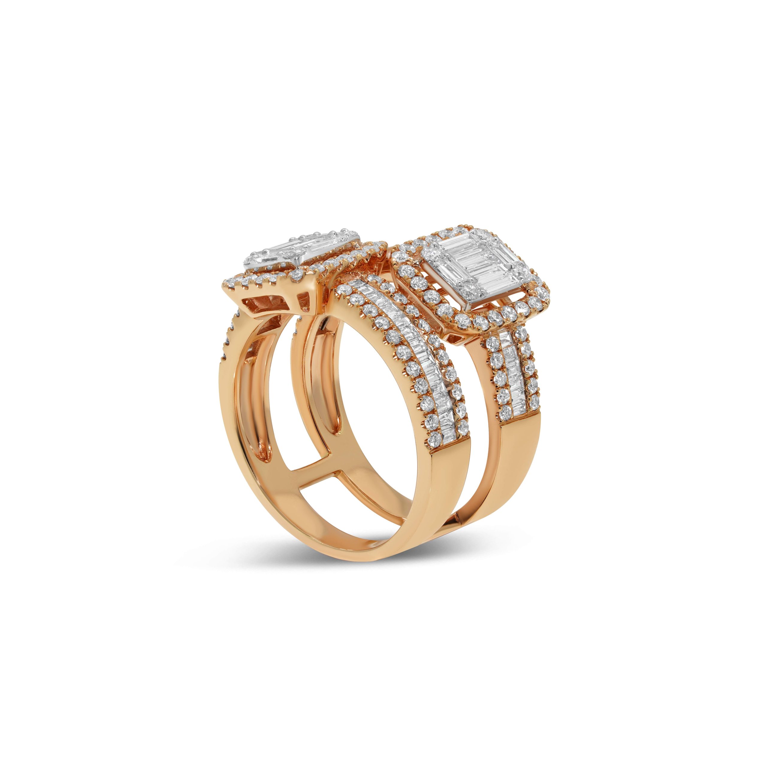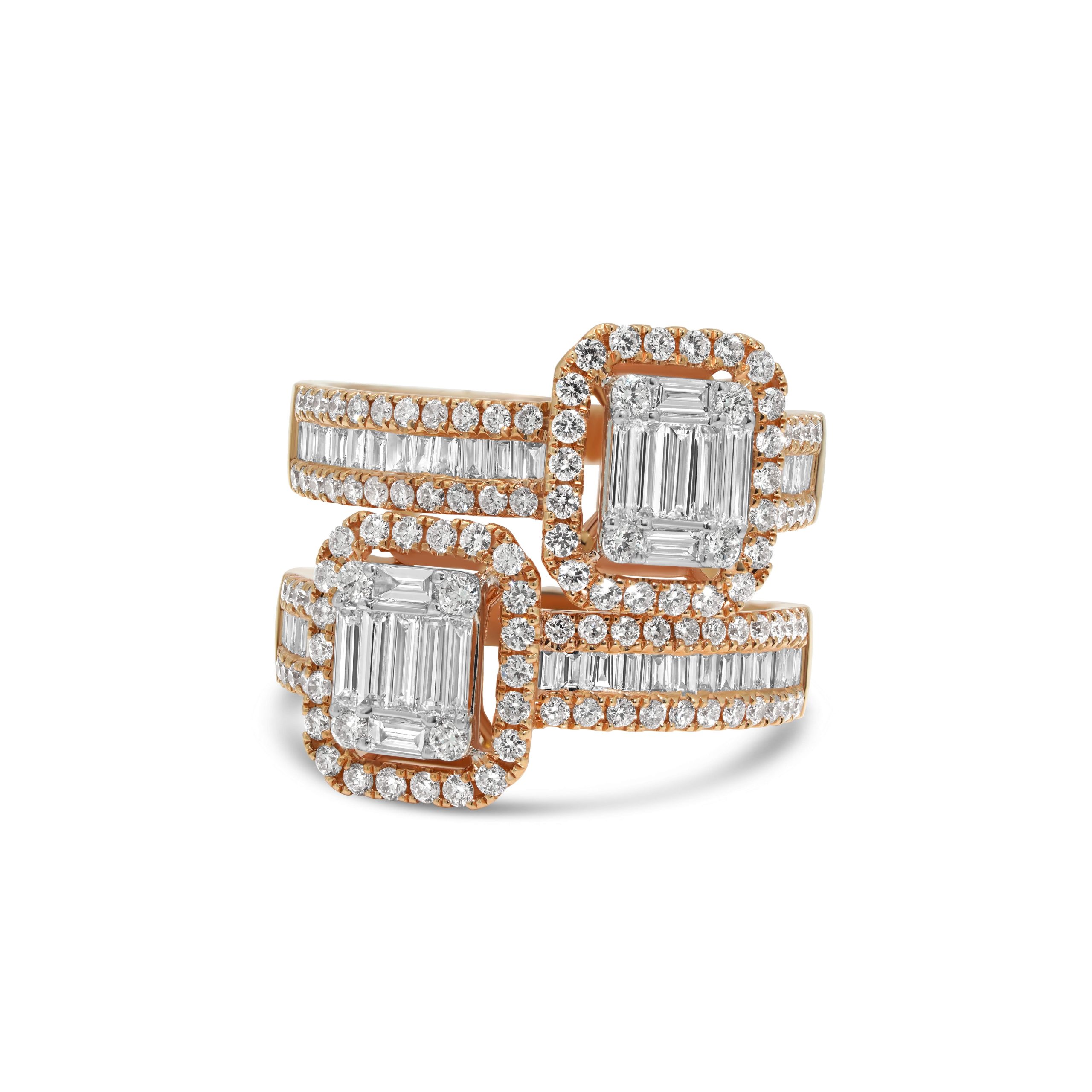 Indulge in the charm of our 18 karat rose gold cocktail ring, a mesmerizing fusion of elegance and flair. Adorned with 0.88cts. of round brilliant cut diamonds and 0.87cts. of baguette cut diamonds, this ring is a symphony of sparkle and sophistication. The warm embrace of rose gold enhances the brilliance of each meticulously set diamond, creating a captivating dance of light on your finger. Perfect for special occasions or to elevate your everyday style, this cocktail ring is a declaration of refined taste and contemporary glamour. Embrace the unique allure of this meticulously crafted piece that effortlessly blends classic and modern design elements.