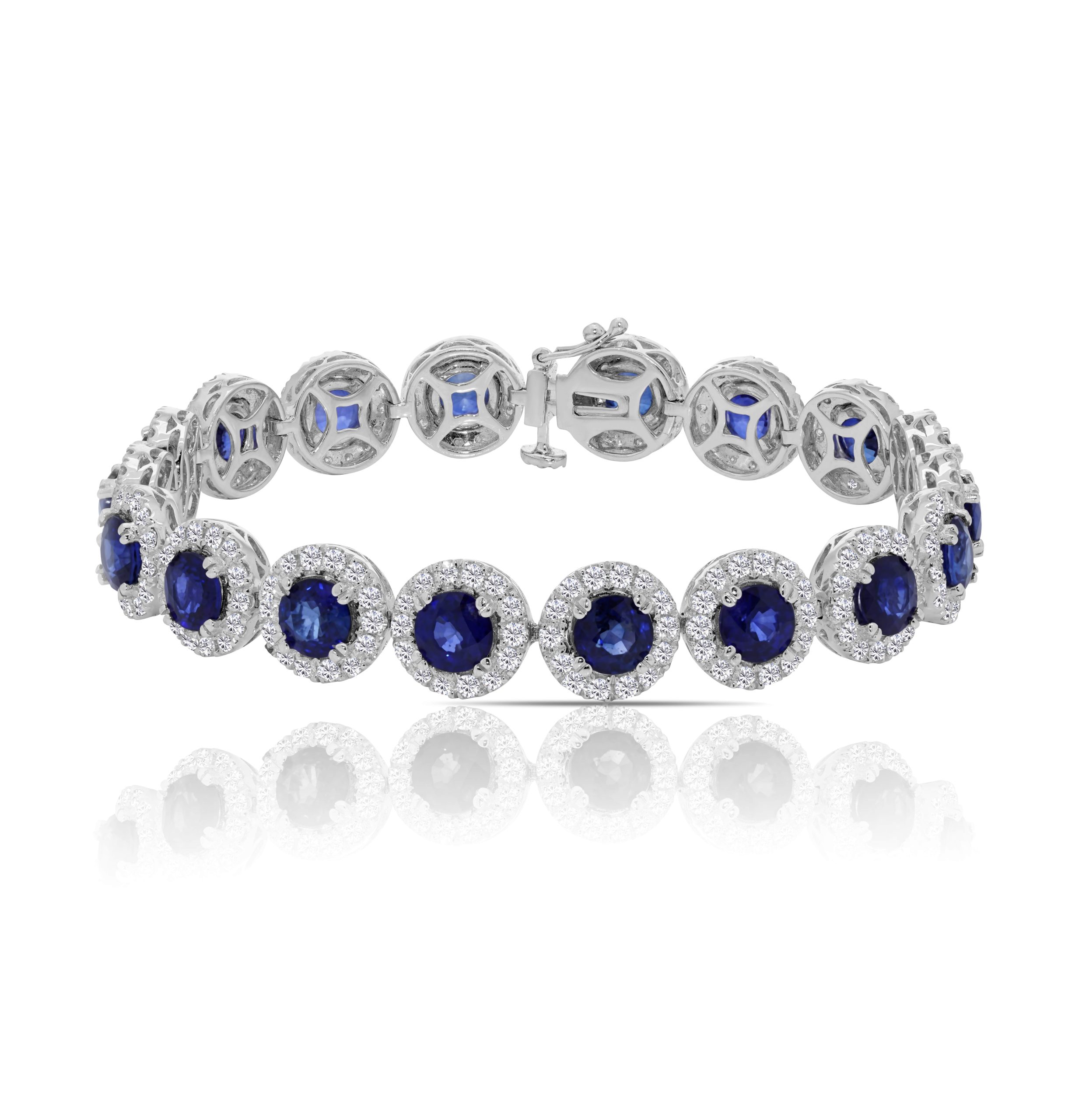 Indulge in the epitome of luxury with our 18 Karat White Gold Diamond and Blue Sapphire Bracelet. This stunning piece features a mesmerizing combination of 4.17cts. of roundbrilliant cut diamonds, arranged in a dazzling halo that beautifully frames 14.24cts. of round blue sapphires. Elegance meets opulence in this exquisite bracelet, where the rich allure of blue sapphires is enhanced by the sparkle of brown diamonds. The 18 karat white gold setting adds a touch of timeless sophistication to this masterpiece. Whether worn for a special occasion or as a daily statement of style, this bracelet embodies the perfect fusion of classic and contemporary beauty. Elevate your look and embrace the allure of this exquisite jewelry piece.