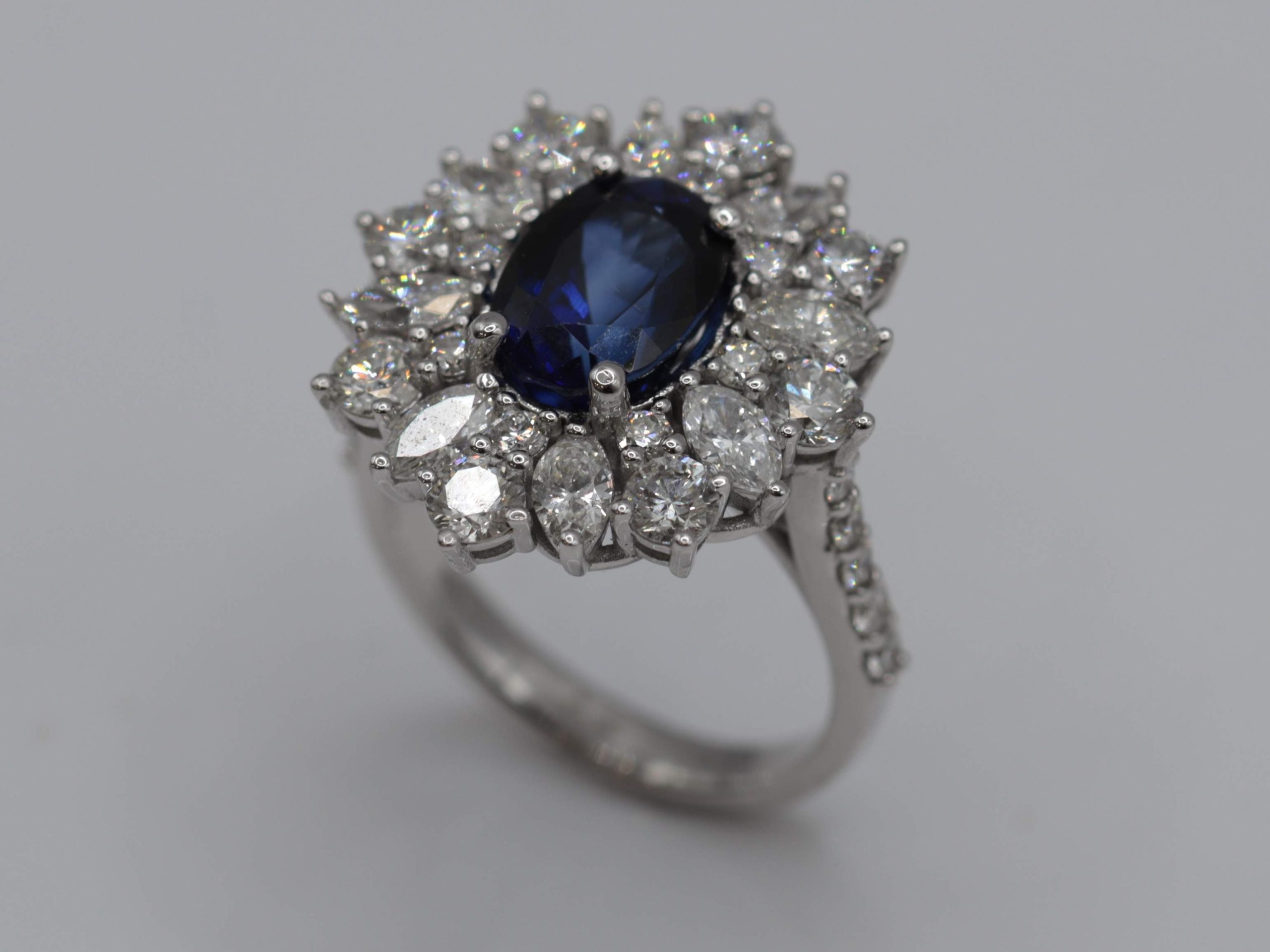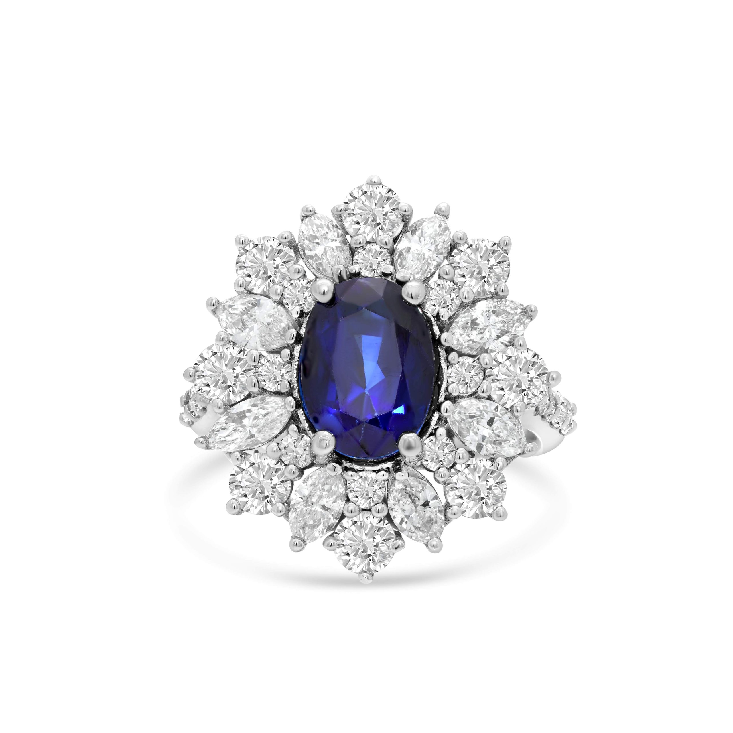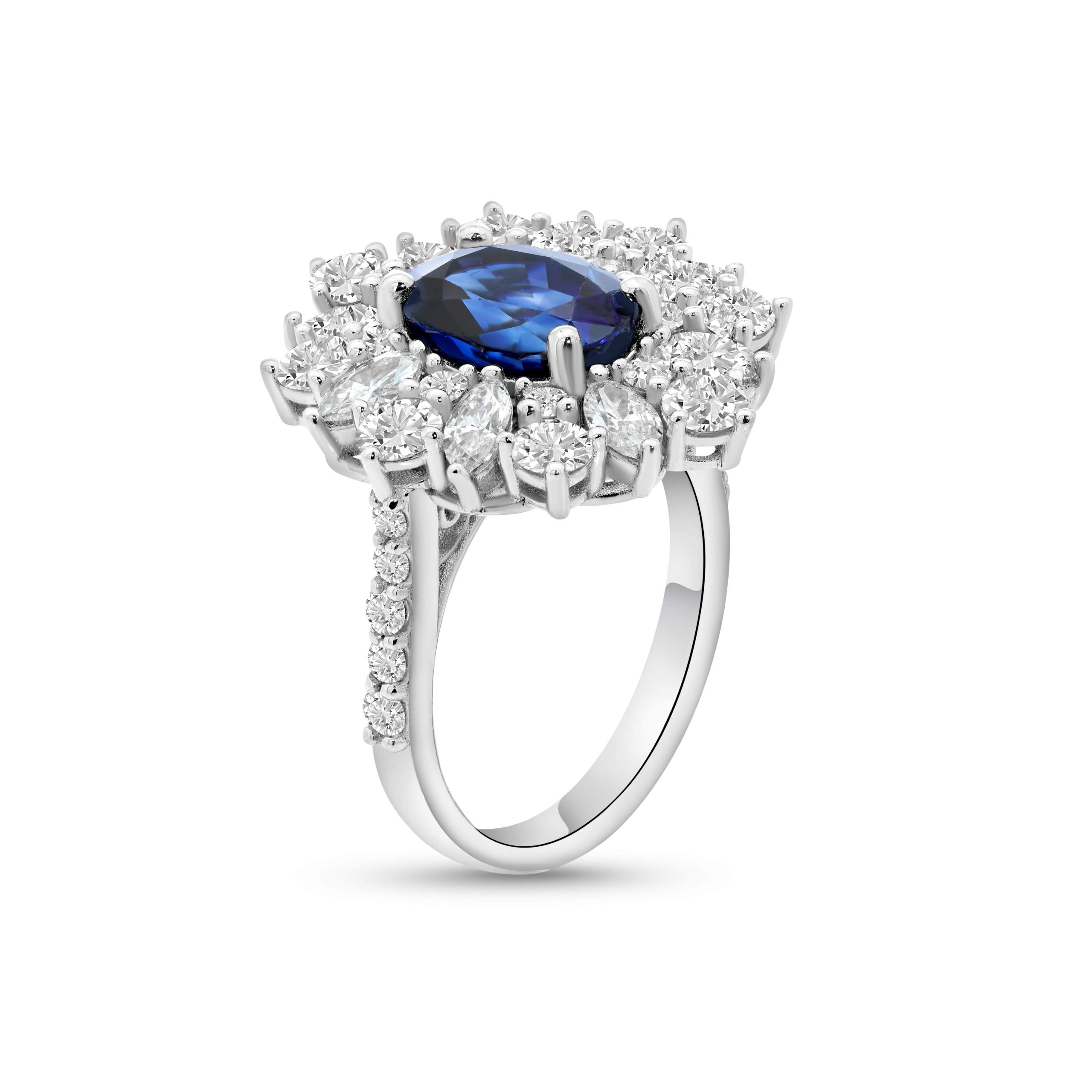 Introducing pure elegance: our exceptional 18 karat white gold diamond ring, featuring a stunning 3.85ct. oval shaped blue sapphire as the centerpiece. This mesmerizing sapphire is framed by 2.79cts. of marquise cut and round brilliant cut diamonds, forming a radiant halo that beautifully enhances the captivating allure of the central gemstone. The intricate design exudes sophistication and luxury, making this ring a true statement piece that perfectly blends classic beauty with contemporary elegance, a perfect choice for any special occasion or a timeless addition to your collection.