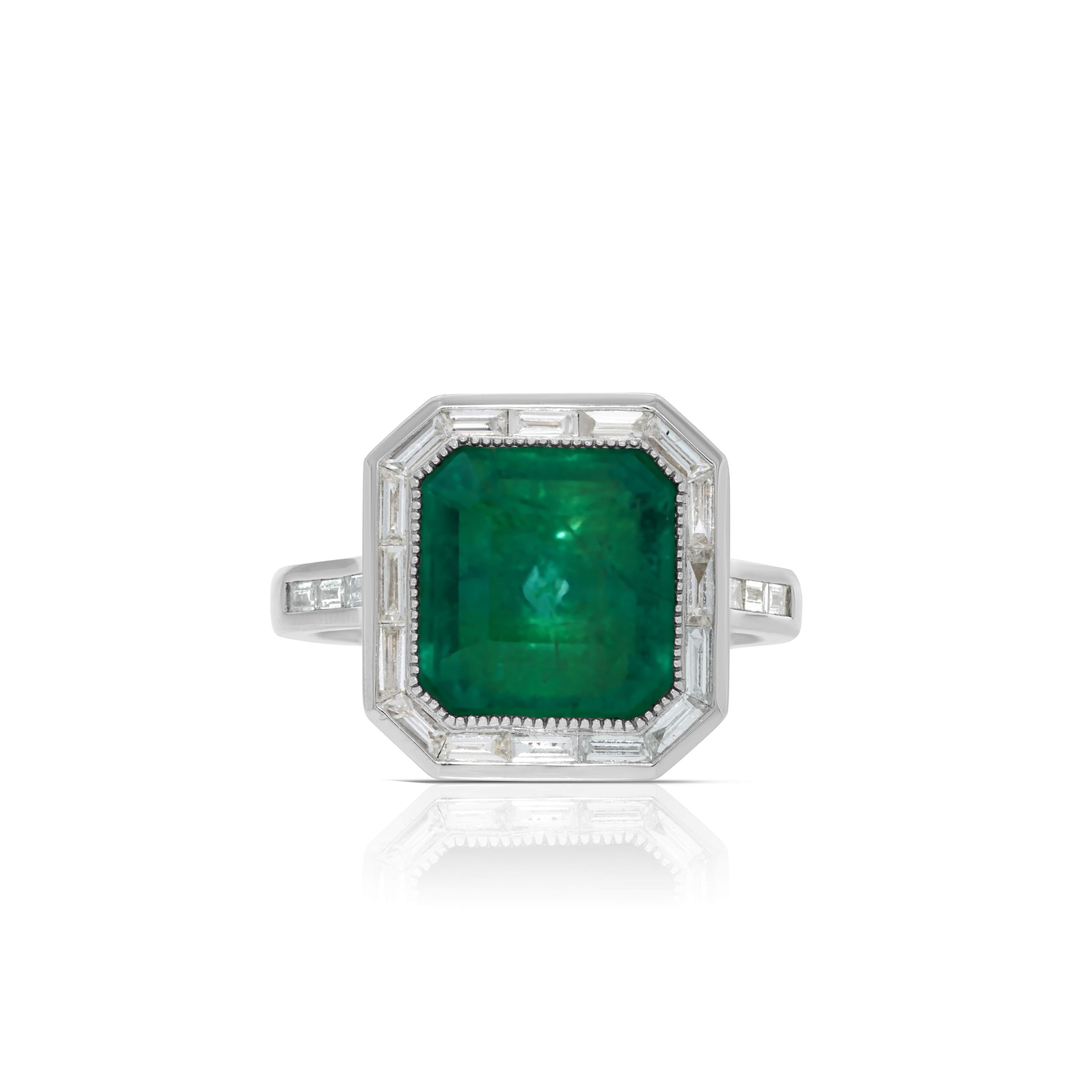 Discover elegance with our exquisite 18 Karat White Gold Ring, featuring a stunning 4.33 carat emerald as its centerpiece, elegantly surrounded by 0.47cts. of baguette cut diamonds meticulously set in a channel setting. This captivating ring embodies sophistication and style, with the vivid beauty of the emerald complemented by the sparkle of the surrounding diamonds. Whether it’s for a special occasion or to add a touch of grace to your daily look, this ring is the perfect choice. Experience the timeless allure of white gold and the mesmerizing charm of an emerald, making this ring a true reflection of refined taste and luxury.