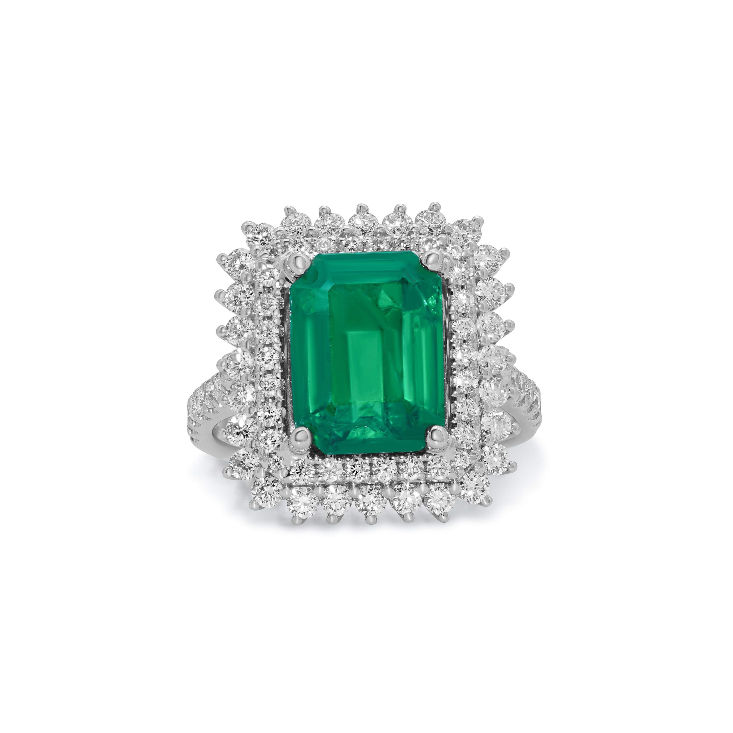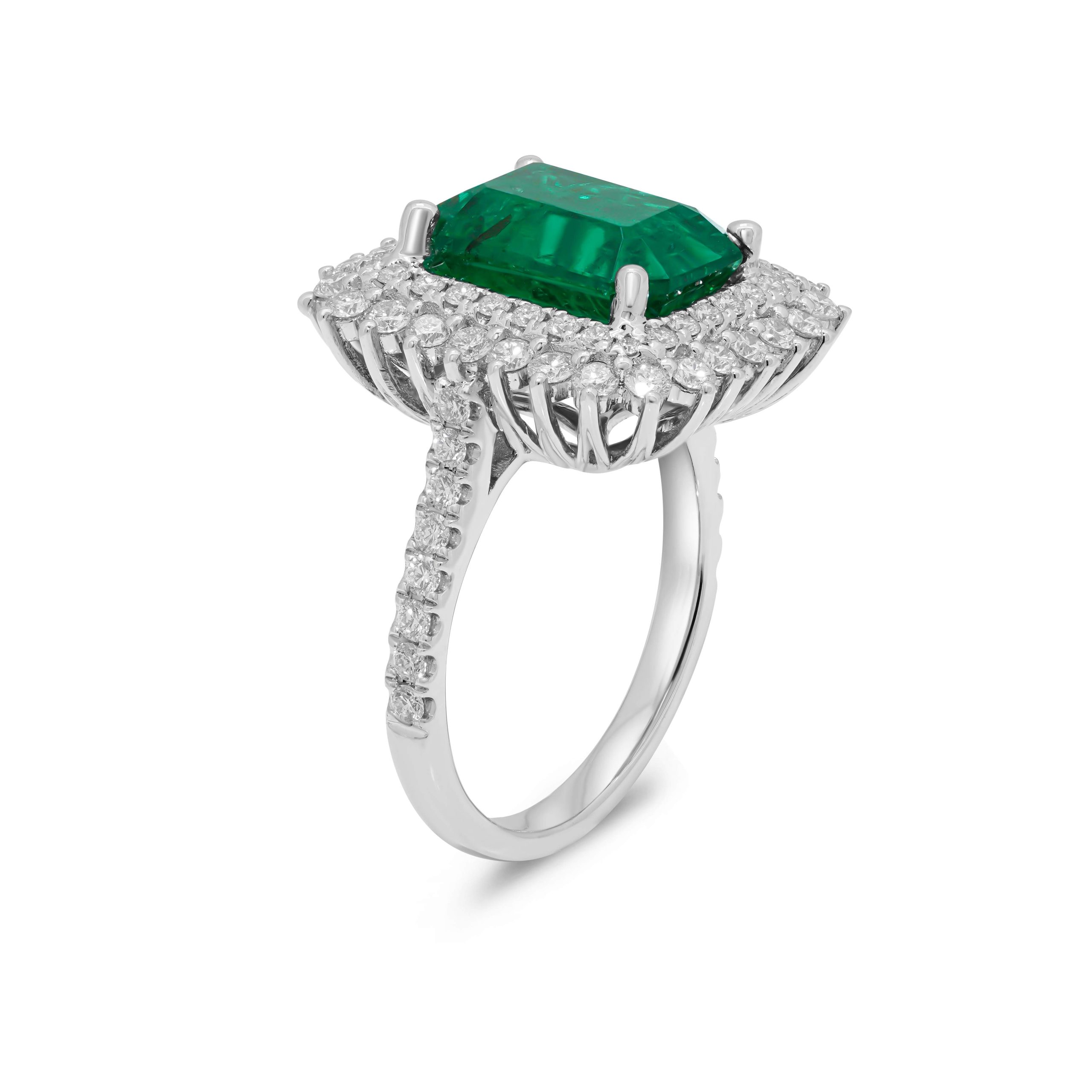 Experience unparalleled elegance with our 18 karat white gold halo style diamond ring. At the heart of this stunning piece is a captivating 4.10ct. emerald, exuding a rich, vibrant green hue that commands attention. Surrounding the emerald is a halo of meticulously set diamonds, adding a brilliant sparkle and enhancing the ring’s overall allure. The total diamond weight is 1.11cts., carefully chosen for their exceptional quality and brilliance. Crafted from luxurious 18 karat white gold, this halo style ring embodies timeless beauty and sophistication, making it a perfect choice for special occasions or a remarkable addition to any fine jewelry collection.