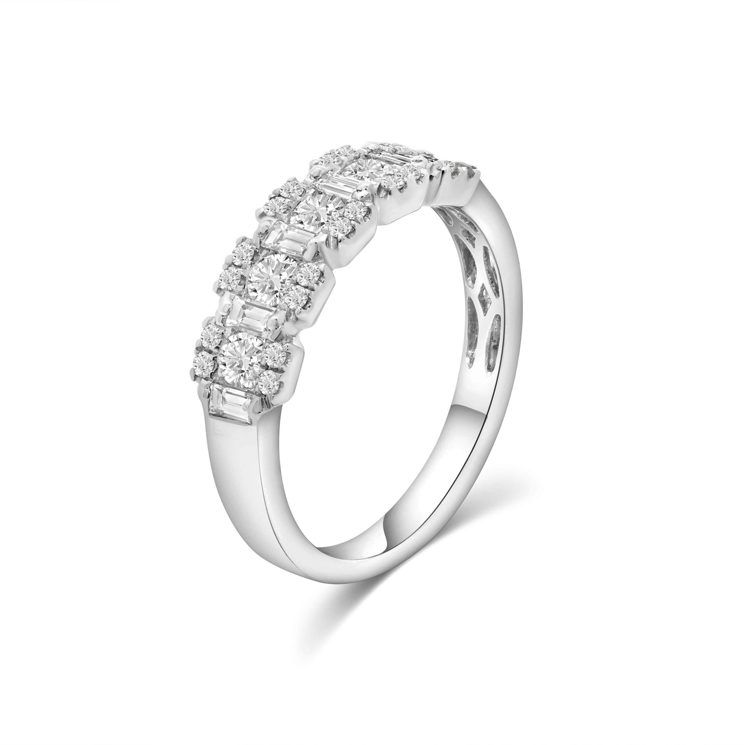 Discover elegance in every detail with our exquisite 18 karat white gold diamond band. Adorned with a stunning total of 0.49cts. of round brilliant cut diamonds and 0.23cts. of captivating baguette cut diamonds, this meticulously crafted piece exudes sophistication and timeless beauty. Elevate any occasion with this shimmering symbol of luxury and refinement.