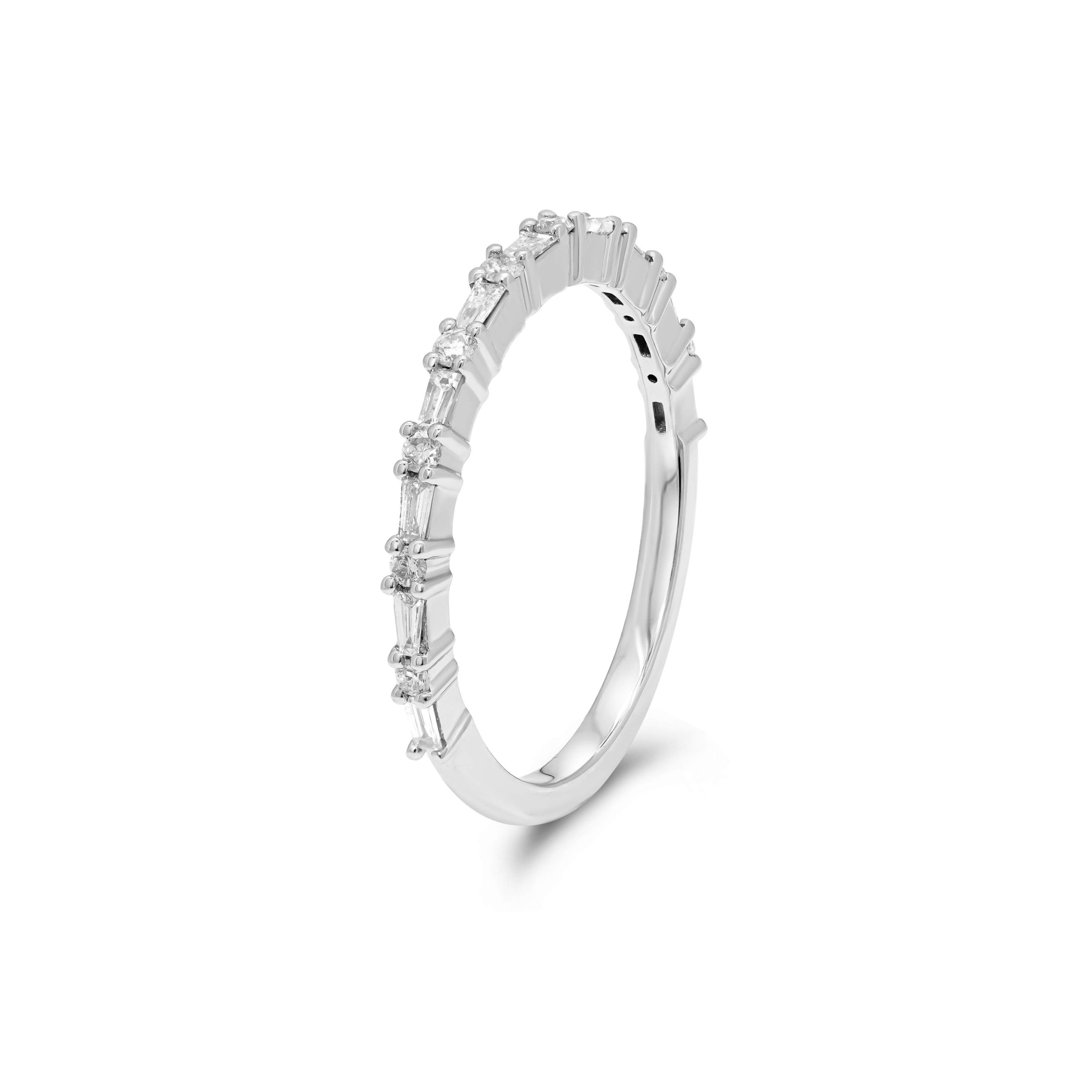 Discover refined elegance with our 18 karat white gold diamond band, a perfect blend of classic and contemporary design. This exquisite band features a harmonious arrangement of baguette and round brilliant cut diamonds, totaling 0.17cts. and 0.12cts. respectively. Each diamond is meticulously set in a secure prong setting, alternating between baguette and round cuts to create a stunning visual effect. Crafted with precision and attention to detail, this band exudes sophistication and timeless charm. Elevate your jewelry collection with the graceful allure of this radiant diamond band, ideal for any occasion.