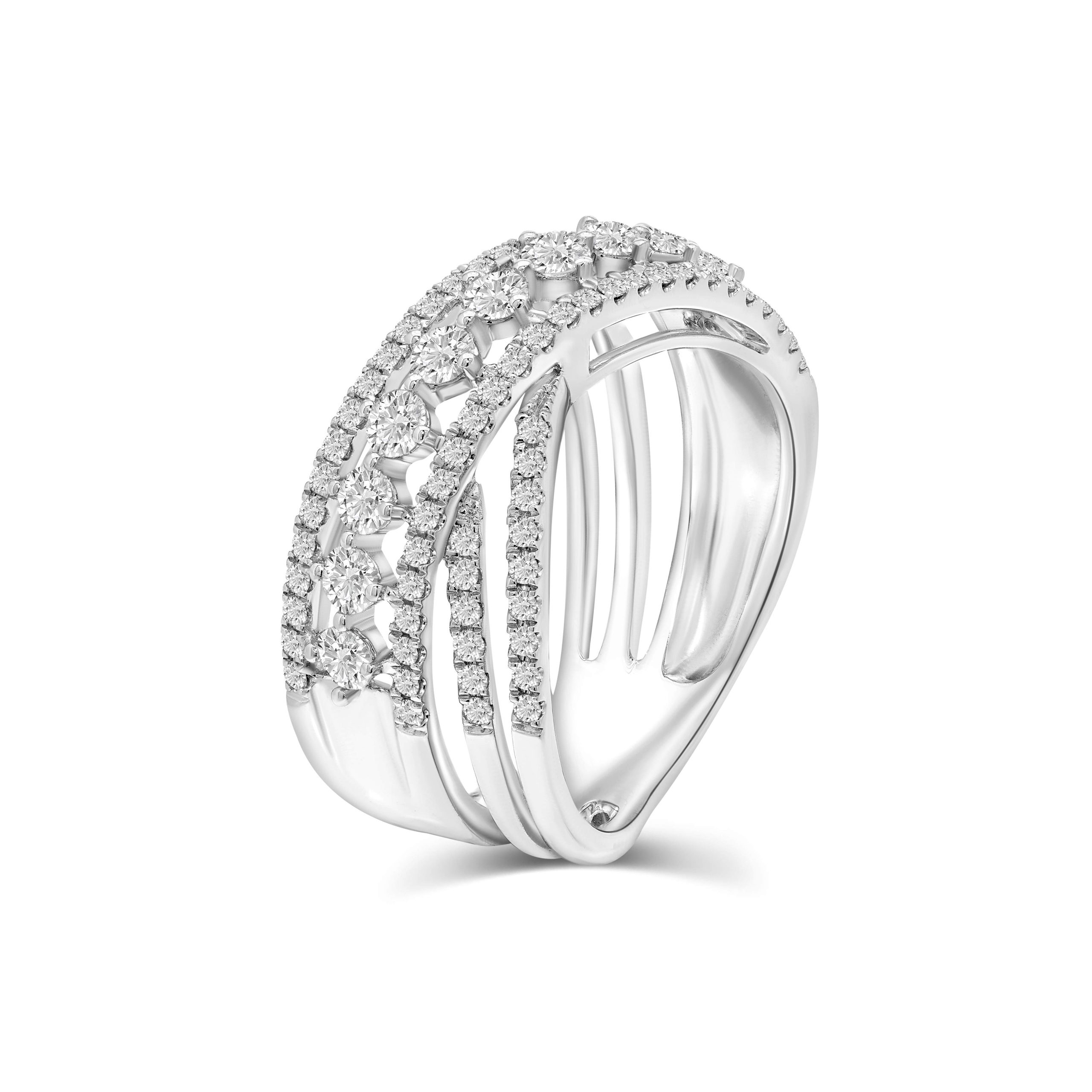 Dazzle in our 18 karat white gold diamond cocktail ring, featuring a captivating kris cross pattern adorned with multiple rows of round brilliant cut diamonds totaling 0.97cts. This uniquely designed ring exudes contemporary elegance, showcasing a perfect balance of modern style and timeless sparkle. Elevate your look with this exceptional piece that adds a touch of sophistication to any occasion, making it a must have for those who appreciate distinctive and refined jewelry.