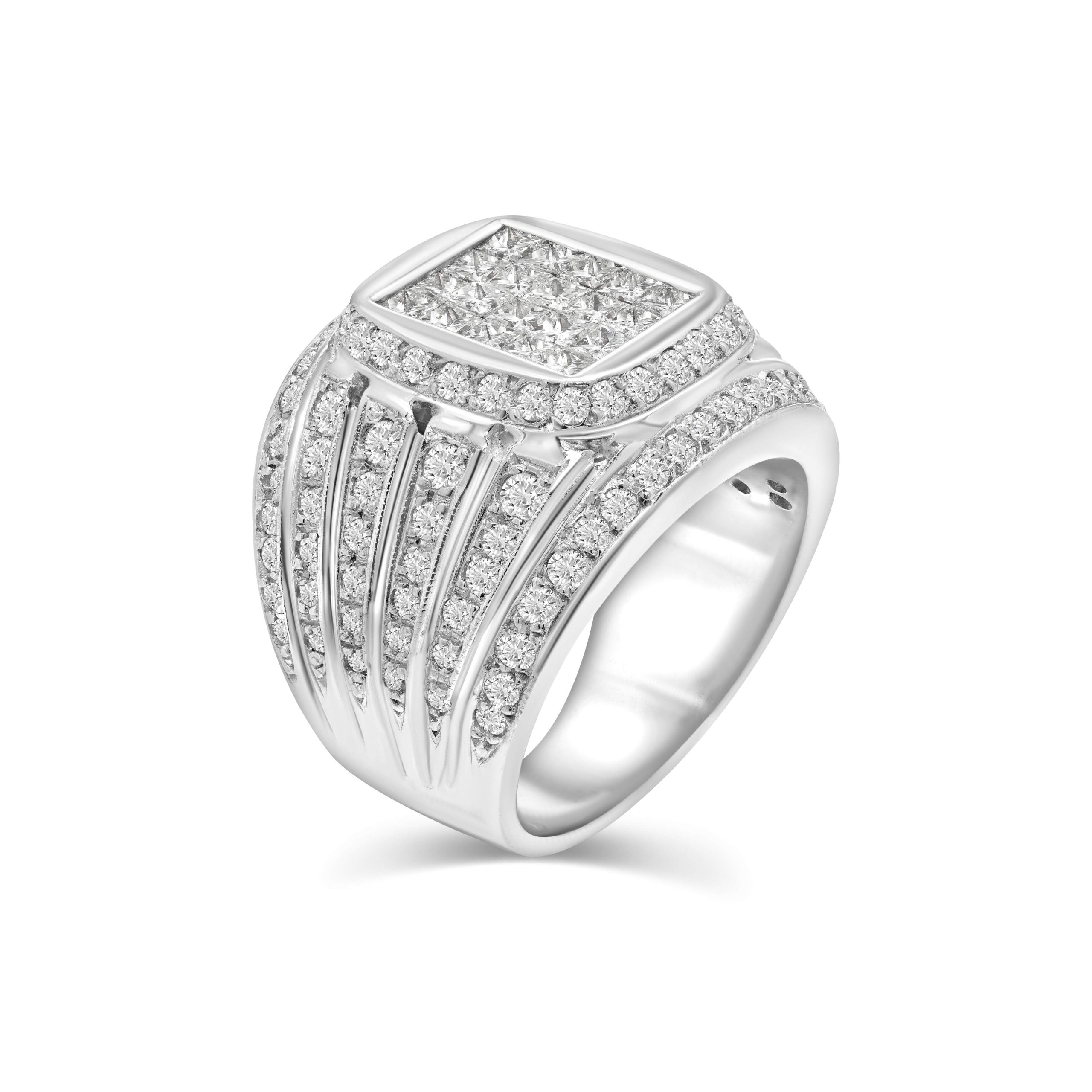 Experience unparalleled glamour with our 18 karat white gold diamond cocktail ring. The centerpiece boasts 1.11cts. of princess cut diamonds set in an enchanting invisible setting, surrounded by a radiant diamond halo. Adding to its brilliance, six additional rows of round brilliant cut diamonds totaling 1.53cts. adorn the band, creating a mesmerizing display of luxury. Elevate your style with this exceptional cocktail ring, a true embodiment of sophistication and refined craftsmanship.