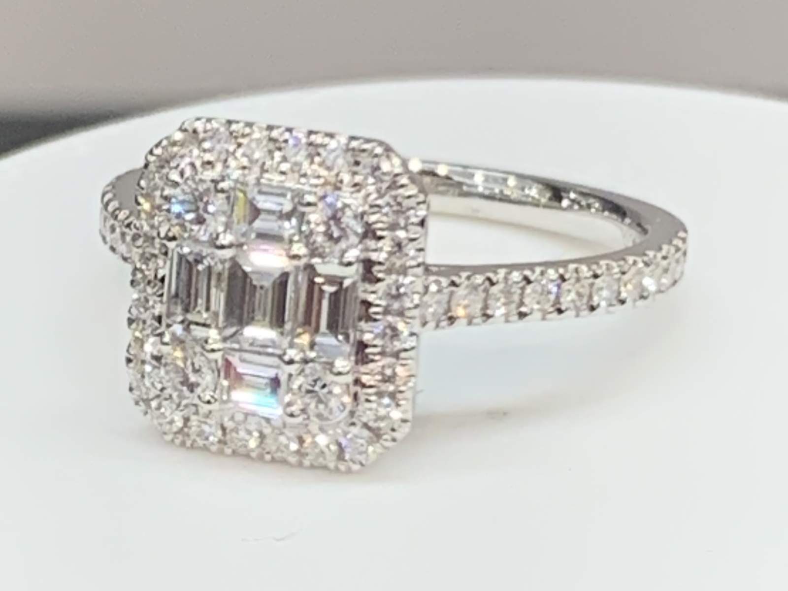 Step into the spotlight with our enchanting 18 karat white gold diamond cocktail ring, a statement piece destined to captivate. Embellished with 0.36cts. of dazzling baguette cut diamonds and 0.42cts. of mesmerizing round brilliant cut diamonds, this ring radiates opulence and allure. Elevate your style with the exquisite craftsmanship and unparalleled brilliance of this luxurious accessory.