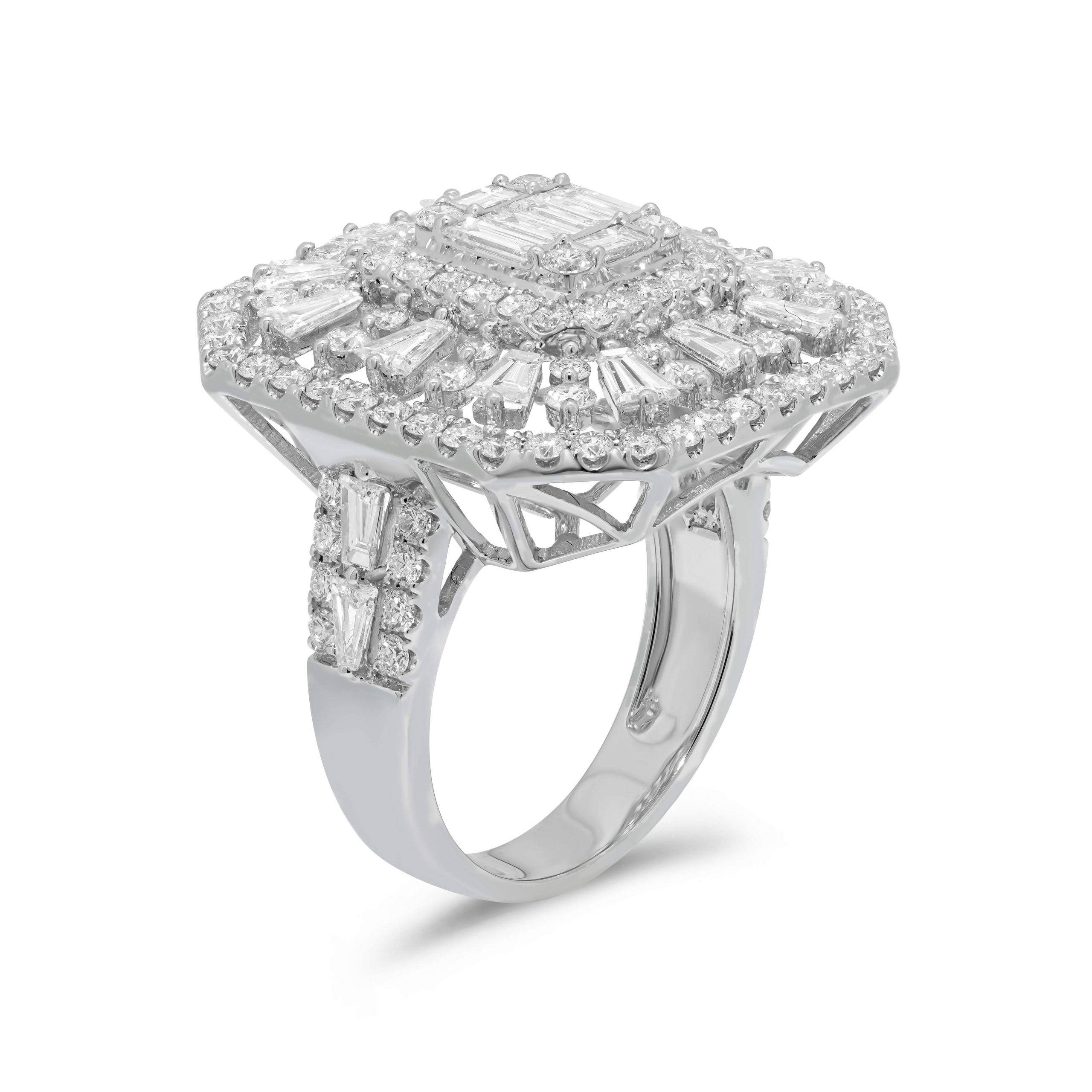 Indulge in timeless elegance with our exquisite 18 karat white gold cocktail ring, adorned with a dazzling display of diamonds. Featuring 2.31cts. of meticulously crafted round brilliant cut diamonds complemented by 1.22cts. of mesmerizing baguette cut diamonds, this stunning piece exudes sophistication and luxury. Elevate any ensemble with the unparalleled brilliance and beauty of this radiant statement ring.