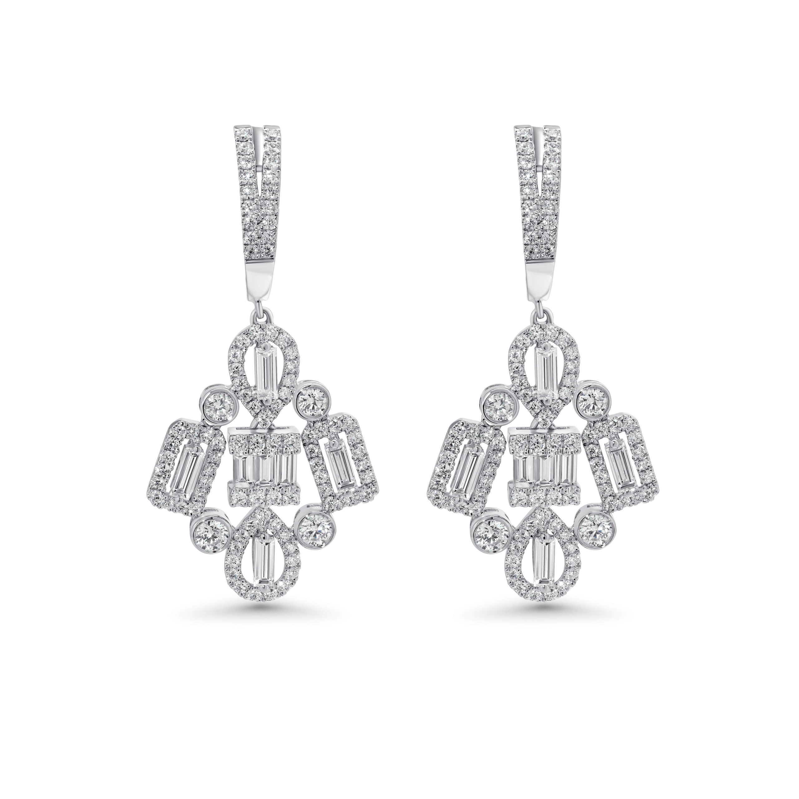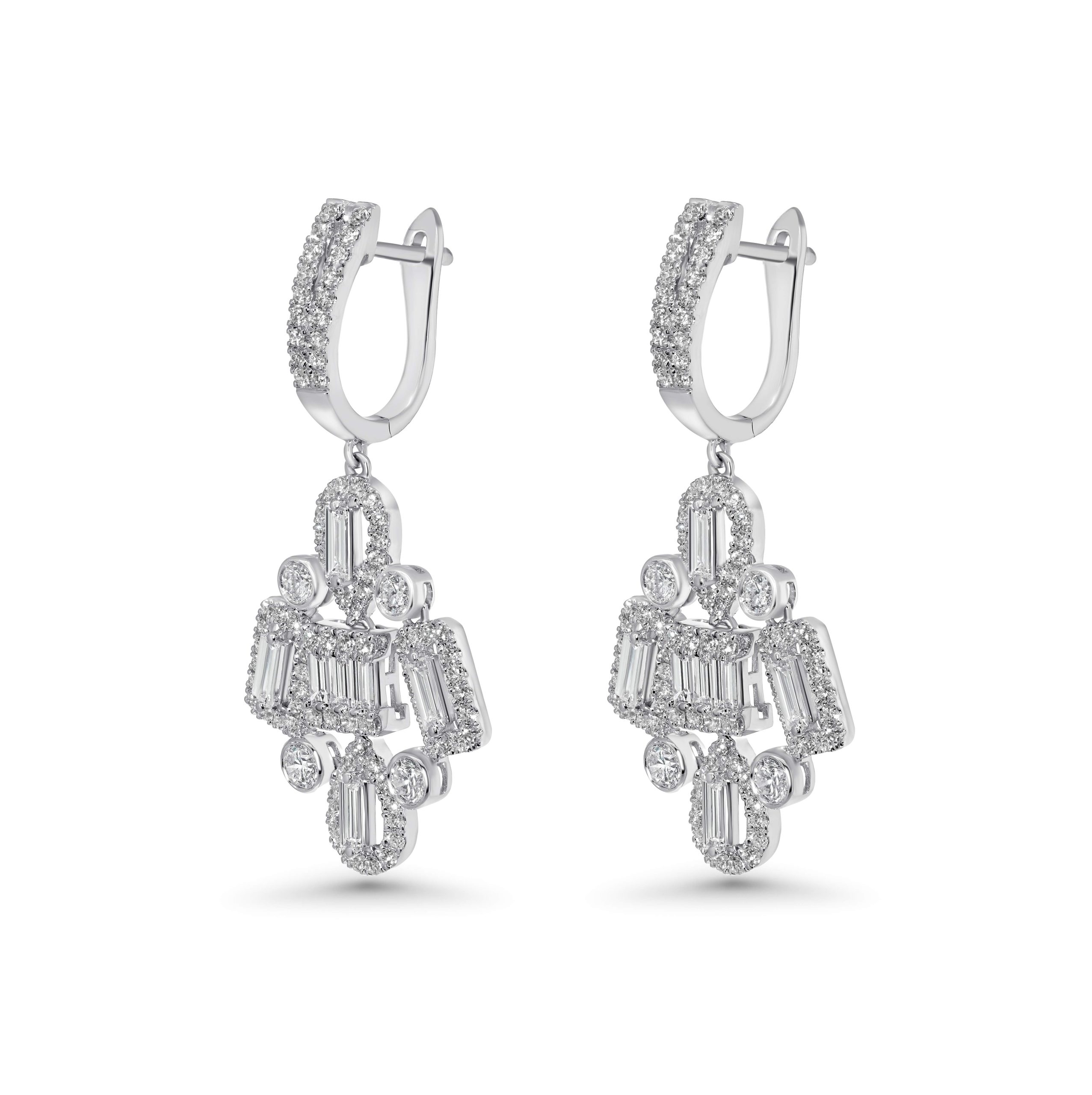 Indulge in the enchanting allure of our 18 karat white gold chandelier earrings…a mesmerizing symphony of diamonds that defines opulence. With 1.54cts. of round brilliant cut diamonds and 0.92cts. of baguette-cut diamonds, these earrings exude a captivating blend of classic and modern elegance. Meticulously set in the luxurious white gold setting, each diamond sparkles with radiant brilliance. Elevate your style and make a statement with these chandelier earrings that effortlessly transition from sophisticated daytime chic to glamorous evening allure. Adorn yourself with the timeless beauty and exquisite craftsmanship of this remarkable pair, destined to be a cherished addition to your jewelry collection.