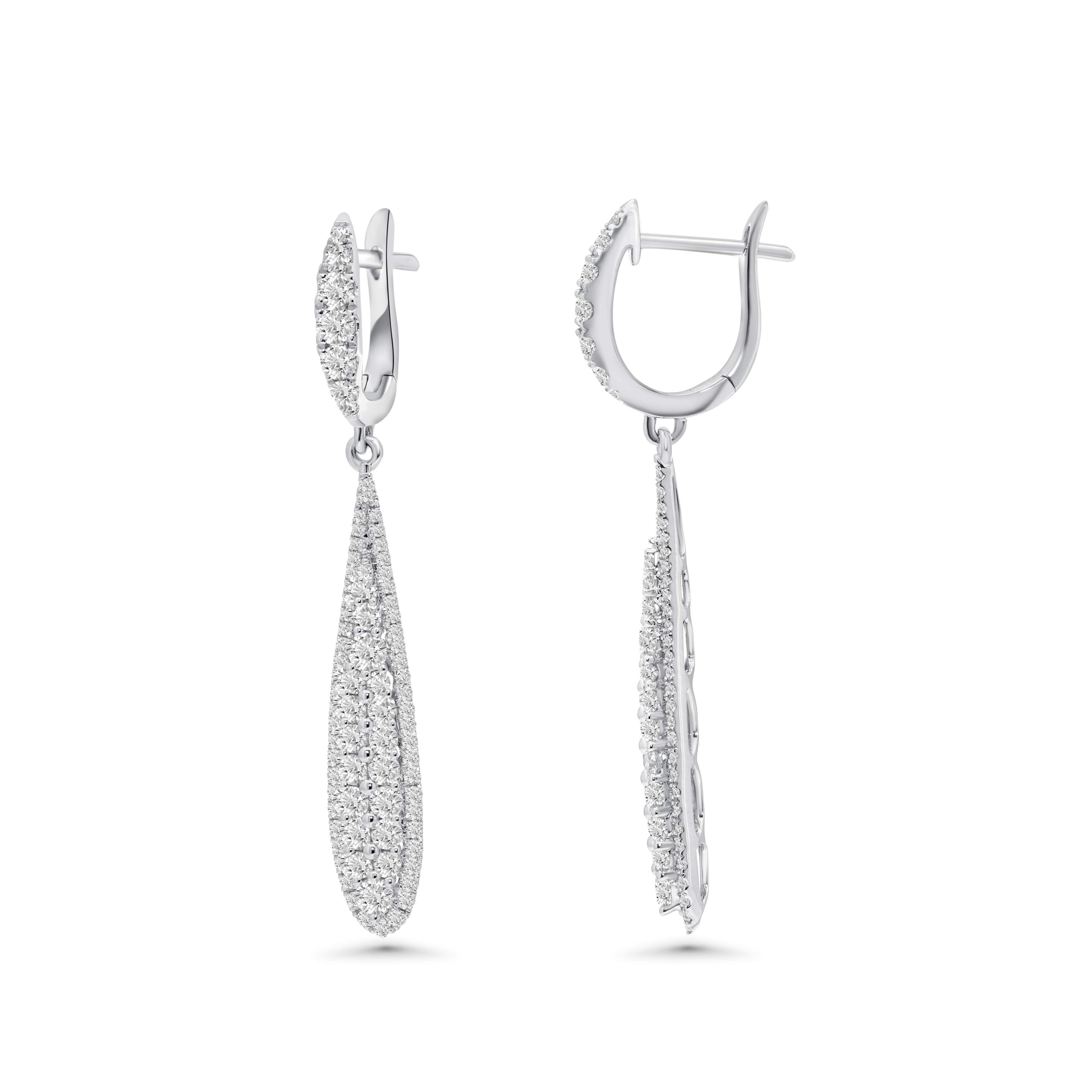 Introducing elegance in motion with our exquisite pair of 18 karat white gold diamond drop earrings in a mesmerizing teardrop shape. These enchanting earrings carry a total carat weight of 1.41cts. of round brilliant cut diamonds, exuding sophistication and grace. These earrings features a brilliant arrangement of diamonds, delicately cascading in a teardrop design, creating a captivating sparkle. Elevate your style with these stunning earrings, a perfect blend of timeless beauty and modern allure, suitable for any occasion and an ideal addition to your jewelry collection.