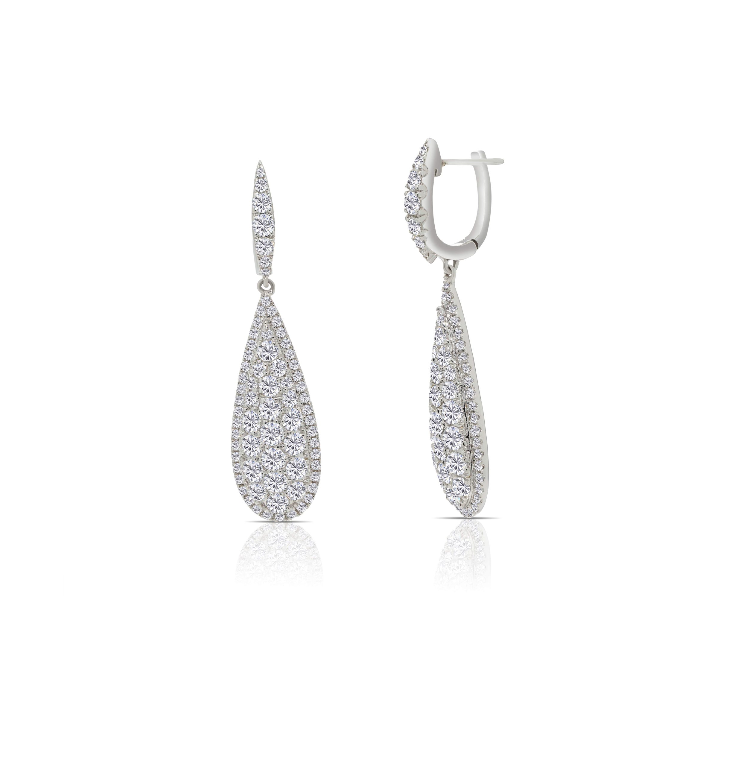 Elevate your elegance with our enchanting 18 karat white gold drop diamond earrings, a celebration of sophistication and luxury. These exquisite earrings boast a total of 3.15cts. of rich round brilliant cut diamonds, meticulously set to exude a captivating allure. The graceful drop design beautifully accentuates the natural brilliance of the diamonds, offering a statement piece that effortlessly complements any ensemble. Radiating timeless charm and modern glamour, these earrings are the epitome of refined beauty, perfect for those seeking to adorn themselves with exceptional grace and style.