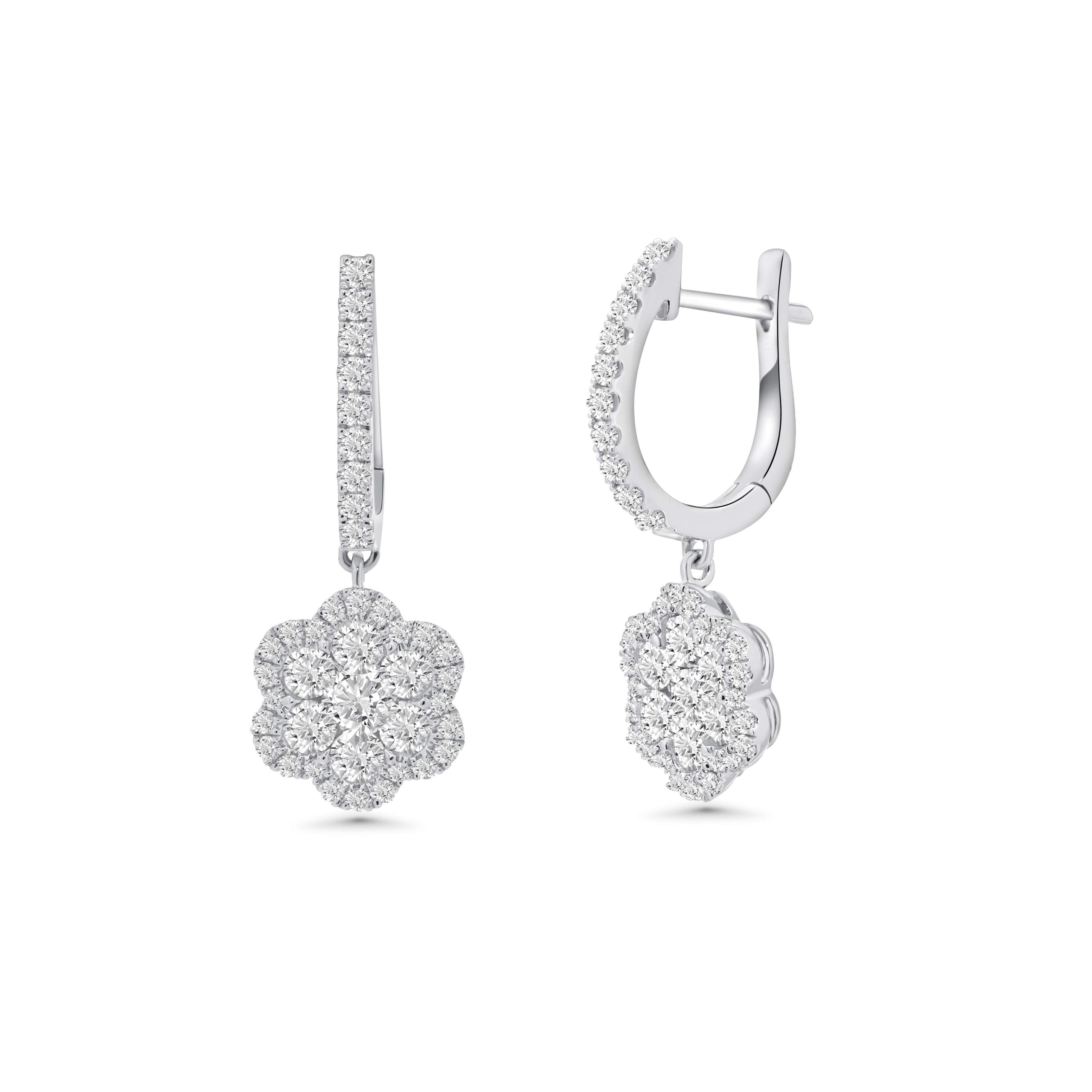 Discover the epitome of elegance with our stunning pair of 18 karat white gold diamond huggies with a delicate floral drop. Adorned with a total carat weight of 1.72cts. of mesmerizing round brilliant cut diamonds, these earrings exude sophistication and charm. The huggie style, combined with the graceful floral drop design, creates an enchanting sparkle that gracefully accentuates your look. Elevate your style with these captivating earrings, a fusion of timeless allure and modern elegance, perfect for any occasion and a beautiful addition to your jewelry collection.