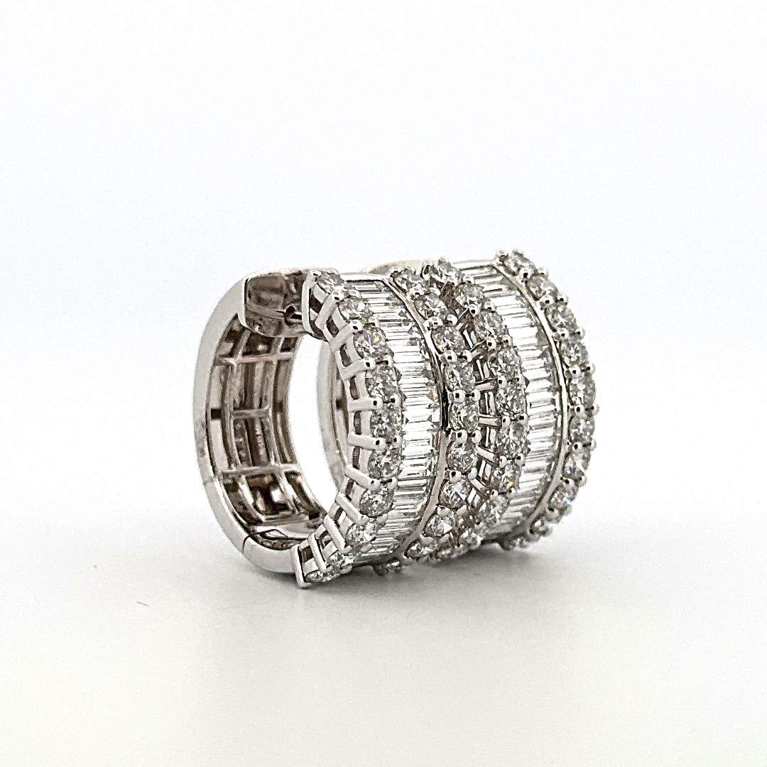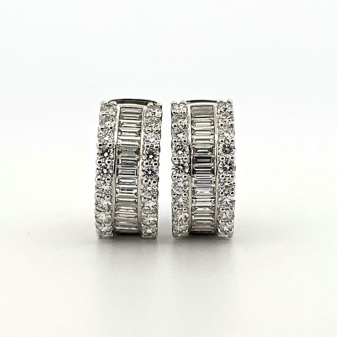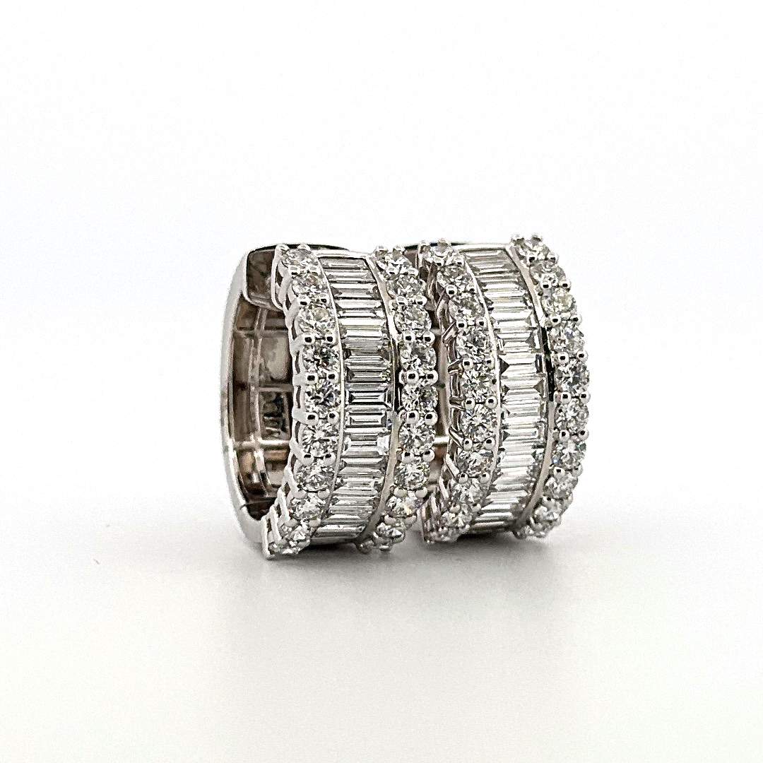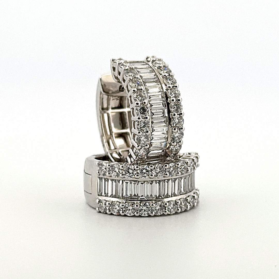 Adorn yourself with the epitome of luxury and sophistication with our breathtaking pair of 18 karat white gold diamond huggie earrings. These stunning earrings feature a total of 1.16cts. of mesmerizing baguette cut diamonds, meticulously set in a sleek channel setting at the center, exuding timeless elegance.Flanking these exquisite baguette diamonds are 1.61cts. of scintillating round brilliant cut diamonds, set in a secure prong setting on each side, adding a captivating sparkle that enhances the allure of these earrings. Effortlessly blending classic charm with modern design, these huggie earrings are a radiant expression of refined taste and opulence.