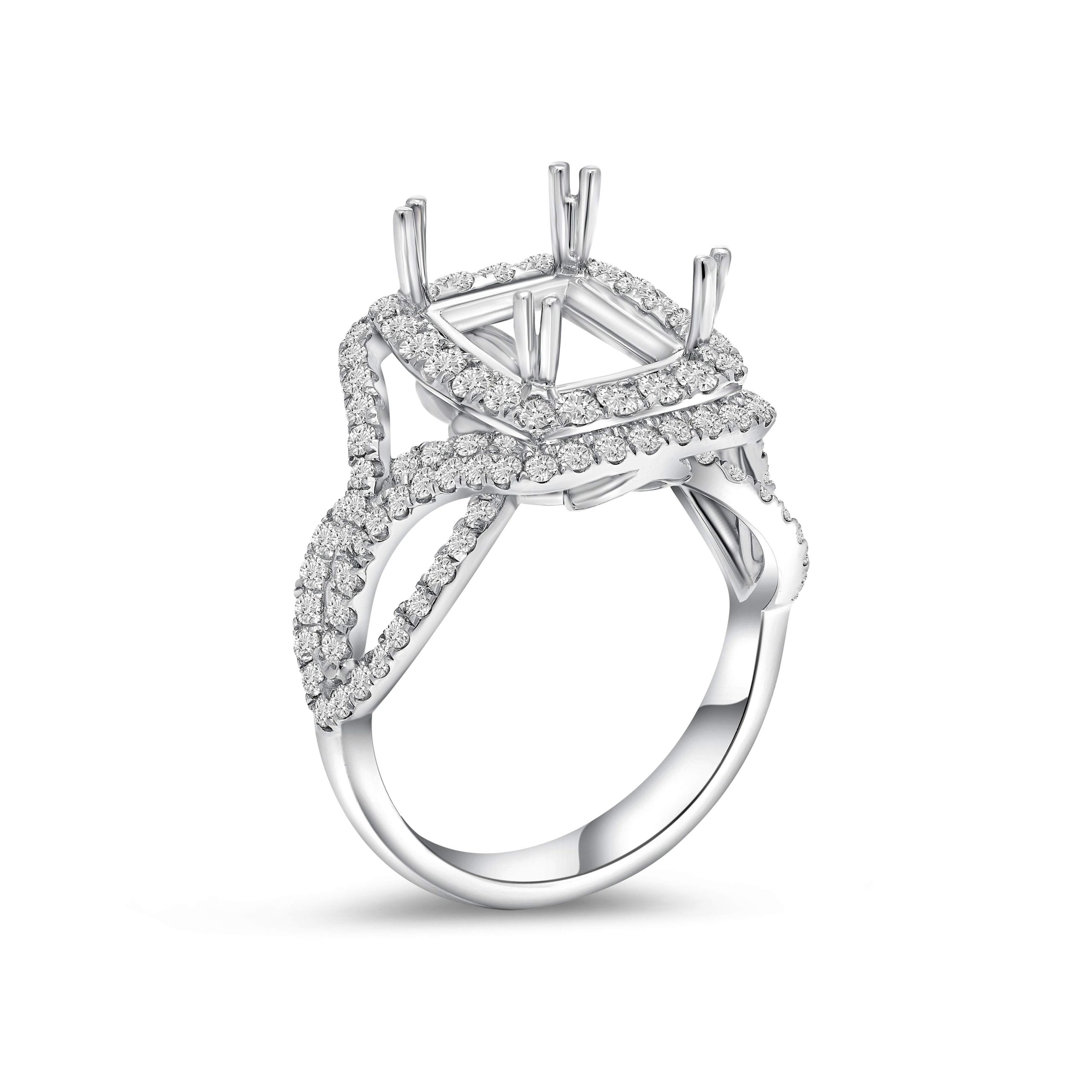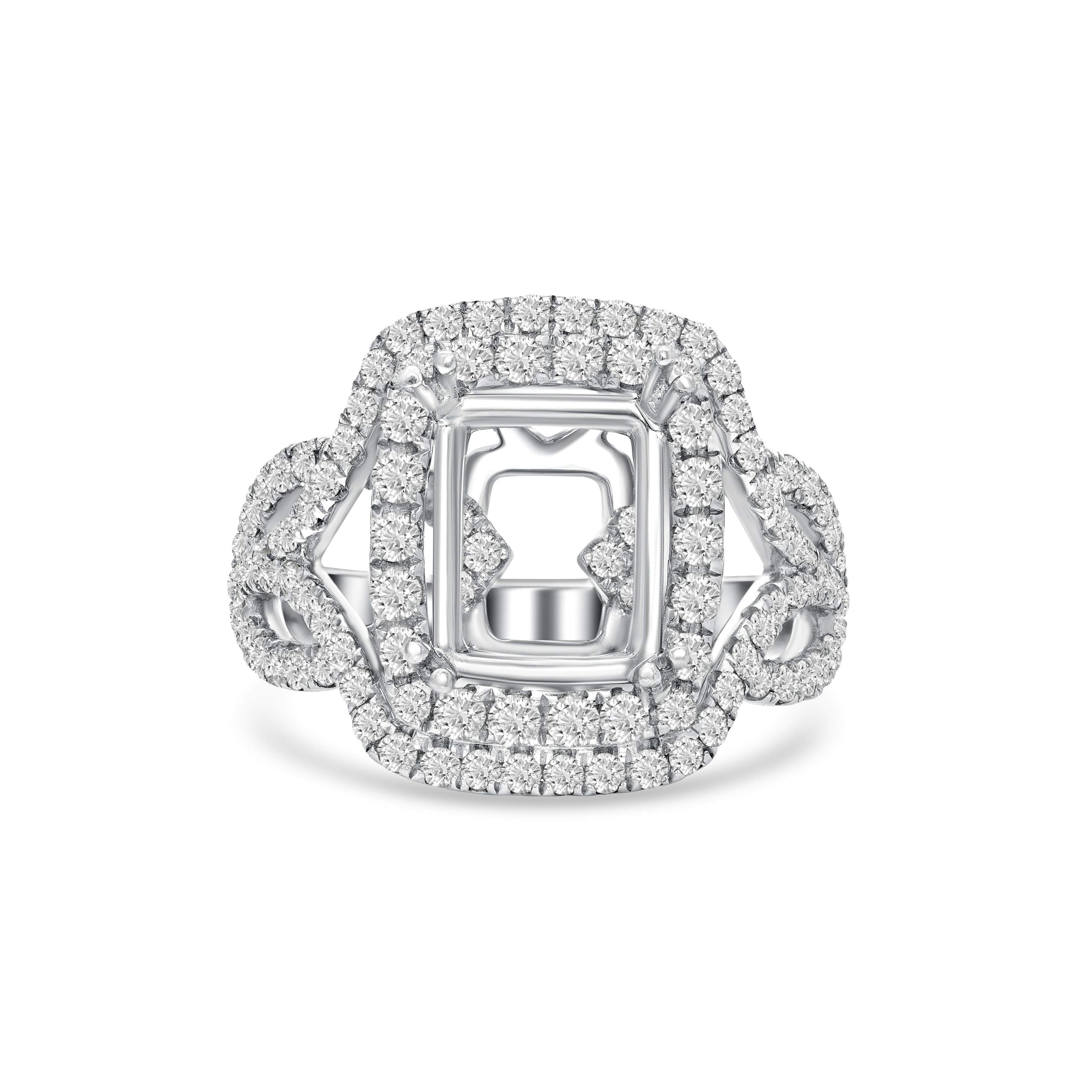 Unveil opulence and sophistication with our 18 karat white gold diamond semi mount ring. A dazzling spectacle of elegance, this ring boasts 1.18cts. of round brilliant cut diamonds intricately set in a double halo, creating a radiant play of light. The open center beckons the choice of a rectangular shaped stone, empowering you to personalize this exquisite piece with a touch of individuality. Meticulously crafted in white gold, this semi-mount ring seamlessly blends classic charm with modern design, offering a timeless canvas for your unique expression. Elevate your collection with a symbol of enduring beauty and personalized allure.