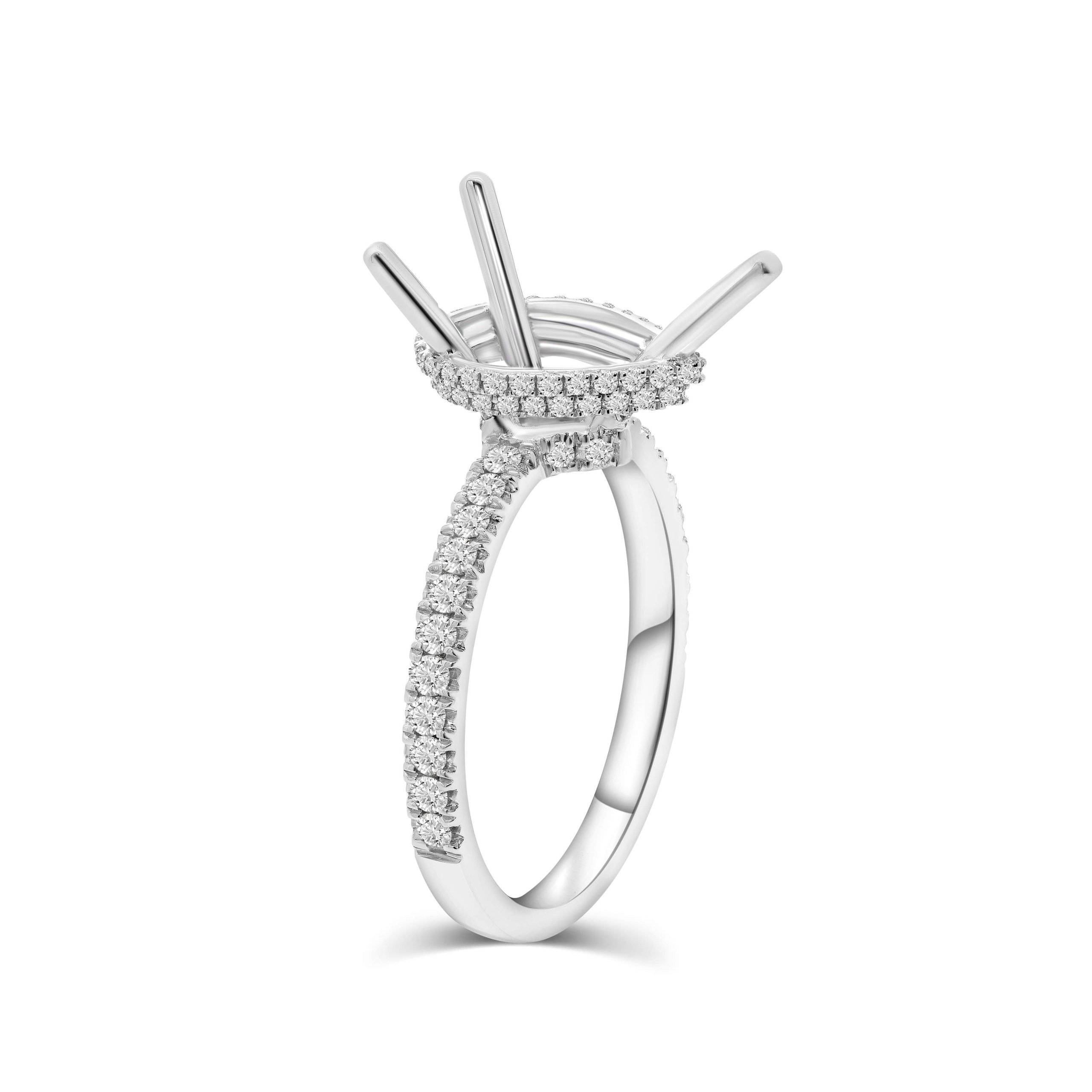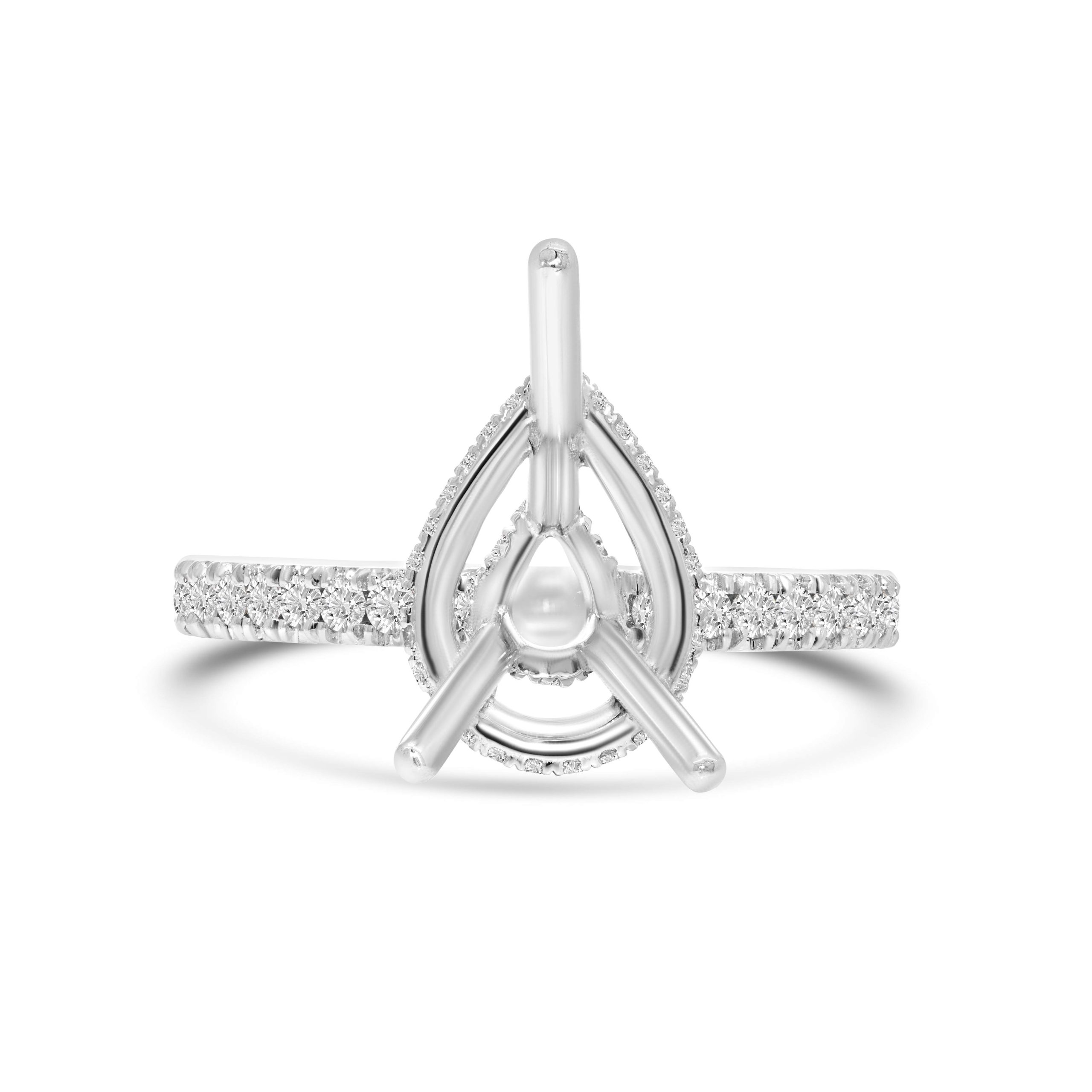 Introducing our enchanting 18 karat white gold hidden halo diamond semi-mount ring–a breathtaking setting designed to accentuate the elegance of a pear shaped center stone. This captivating ring features a concealed double halo of round brilliant cut diamonds, delicately encircling the open center, awaiting a stunning pear shaped stone to take center stage. This ring boasts a total weight of .47cts. of round brilliant cut diamonds.Crafted with meticulous precision, this semi-mount ring allows your chosen center stone to shine, embraced by the hidden halo that enhances its brilliance. With a graceful and timeless design, this ring offers a refined setting for your desired pear shaped gemstone, creating an exquisite and personalized piece that epitomizes sophistication and beauty.