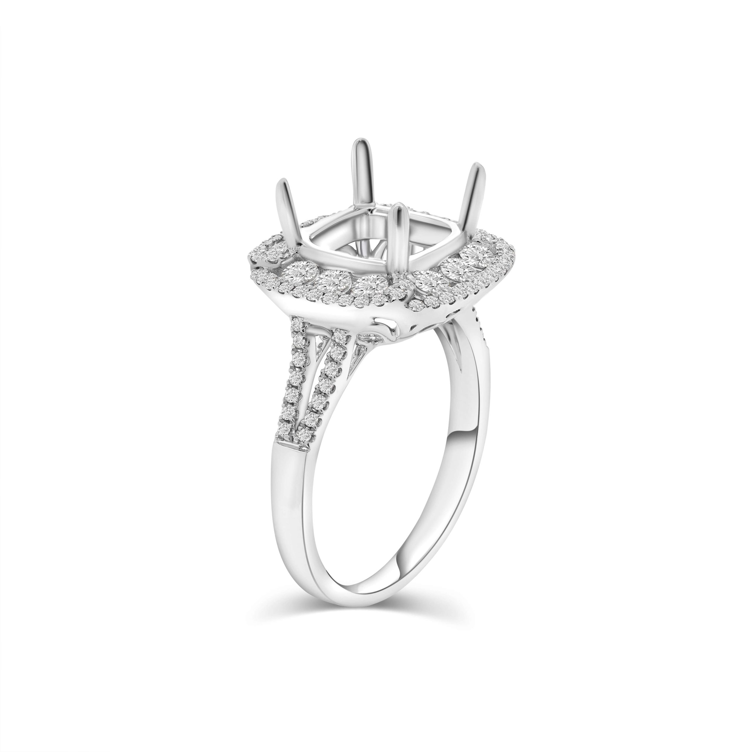 Embrace the elegance of our exquisite 18 karat white gold diamond semi-mount ring–an exquisite canvas awaiting your chosen center stone. This captivating ring boasts a breathtaking double row of round brilliant cut diamonds, meticulously set in a striking halo style, totaling .69cts.The inner row, framing the open center for your selected stone, showcases larger, brilliantly gleaming round diamonds, creating a stunning contrast against the outer row. The outer row features beautifully set round diamonds, perfectly complementing the inner arrangement and adding depth to the overall allure of the ring. Crafted with precision and designed to elevate any chosen center stone, this semi-mount ring is a testament to sophistication and versatility, offering a timeless canvas for your personalized touch.