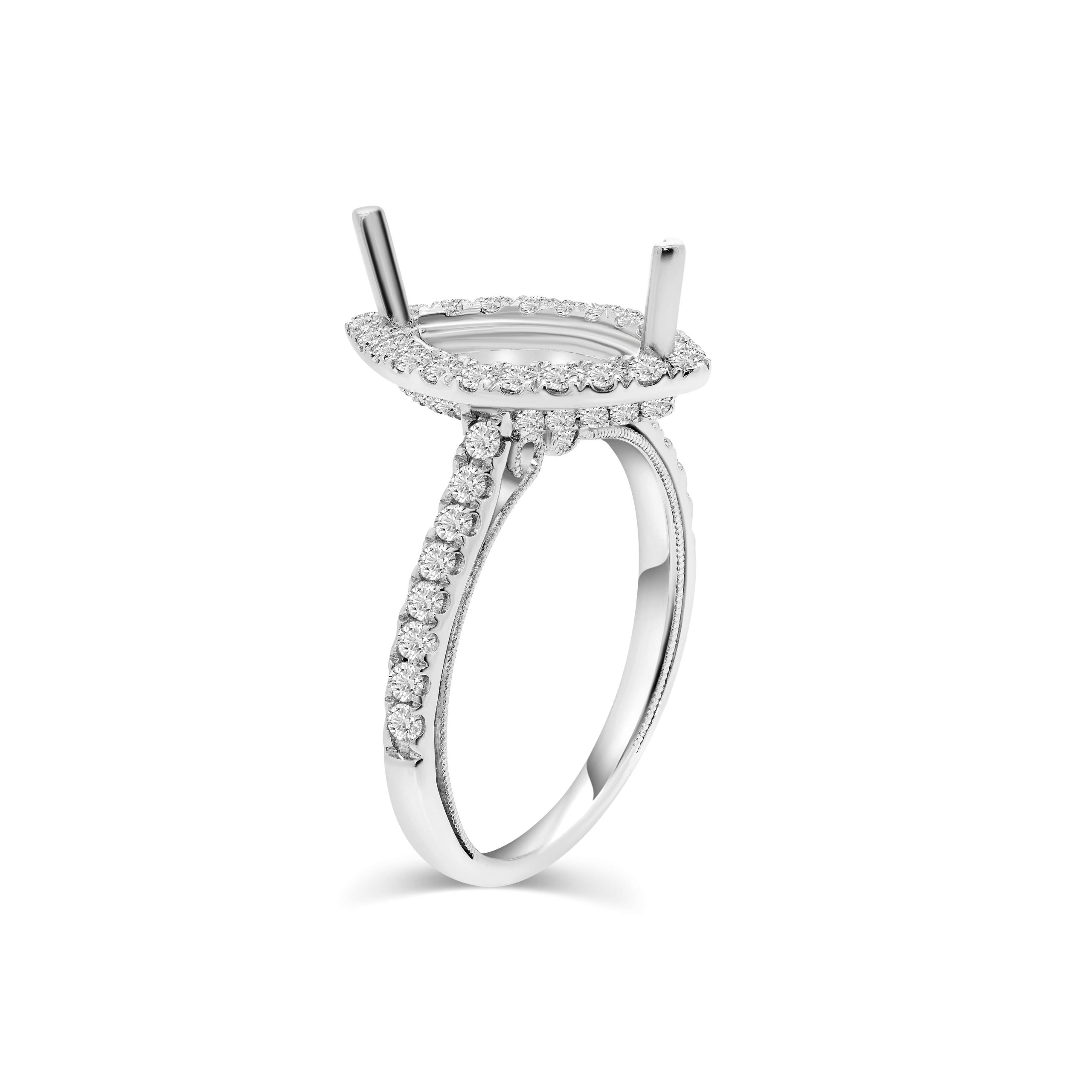 Experience the epitome of elegance with our 18 karat white gold diamond semi-mount ring–a mesmerizing halo style setting designed to accentuate the beauty of a marquise cut diamond center stone. This exquisite ring boasts a total of 0.66cts. of round brilliant cut diamonds meticulously set in a stunning halo formation.Crafted to perfection, this ring awaits your chosen marquise cut diamond to grace its open center, completing its opulent allure. The shimmering halo of diamonds surrounding the center stone-to-be elevates its brilliance, creating a captivating spectacle of light and radiance. A symbol of sophistication and grace, this semi-mount ring is the perfect canvas for your personalized touch and timeless elegance.