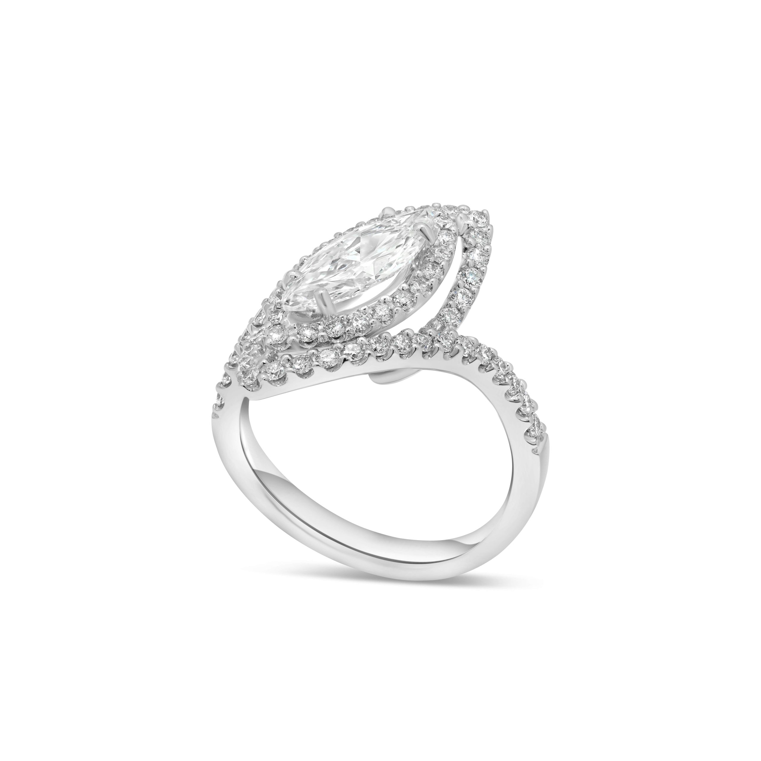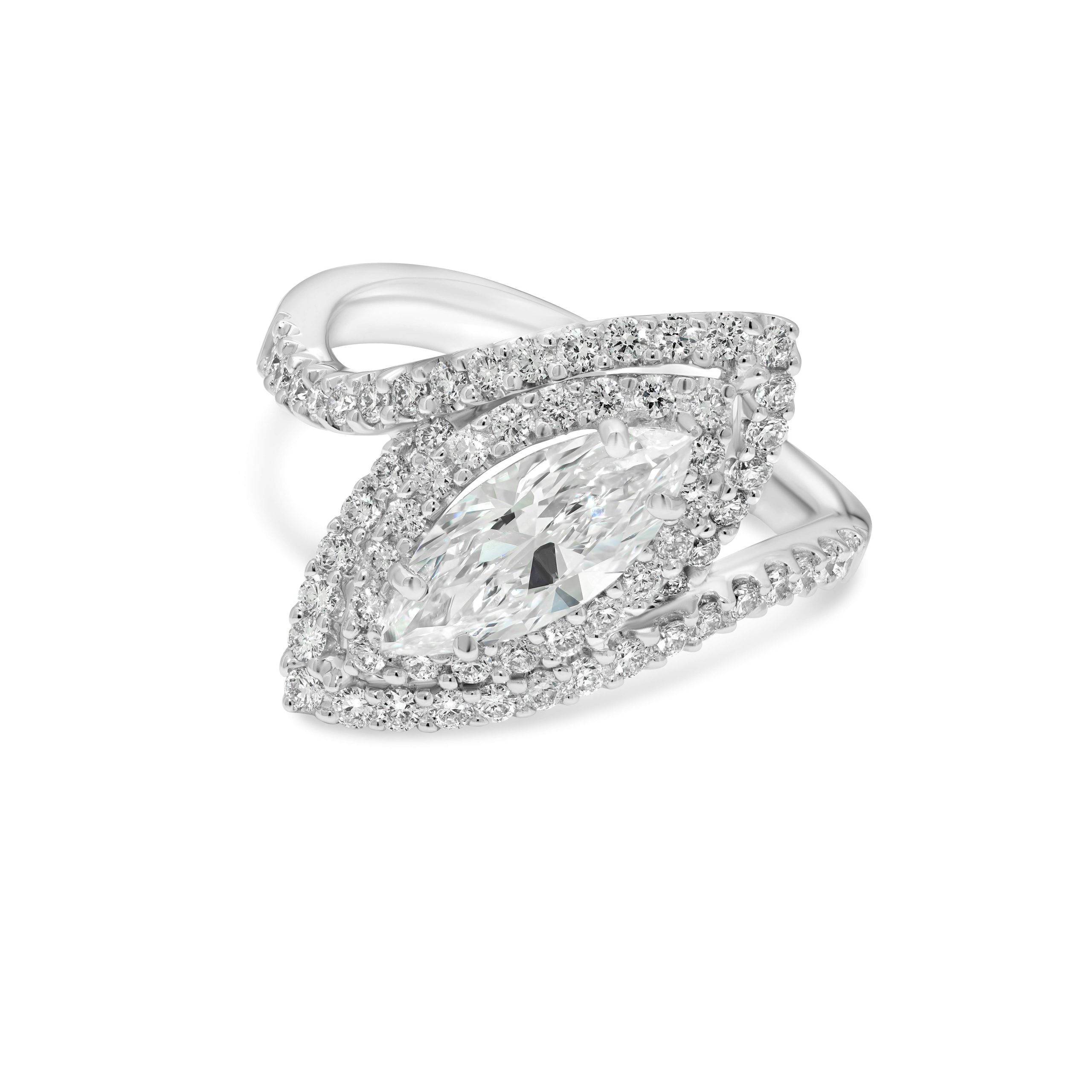Embark on a journey of eternal love with our 18 karat white gold engagement ring, a masterpiece that captures the essence of romance and sophistication. At its heart, a radiant 1.05ct. marquise cut diamond, boasting a captivating blend of color and clarity, set amidst a backdrop of .61 carats of brilliant round cut diamonds. Meticulously crafted for enduring elegance, this ring is more than a symbol–it’s a declaration of commitment and timeless style. Seal your love story with the unparalleled beauty of this 18 karat white gold engagement ring, a reflection of your shared forever.