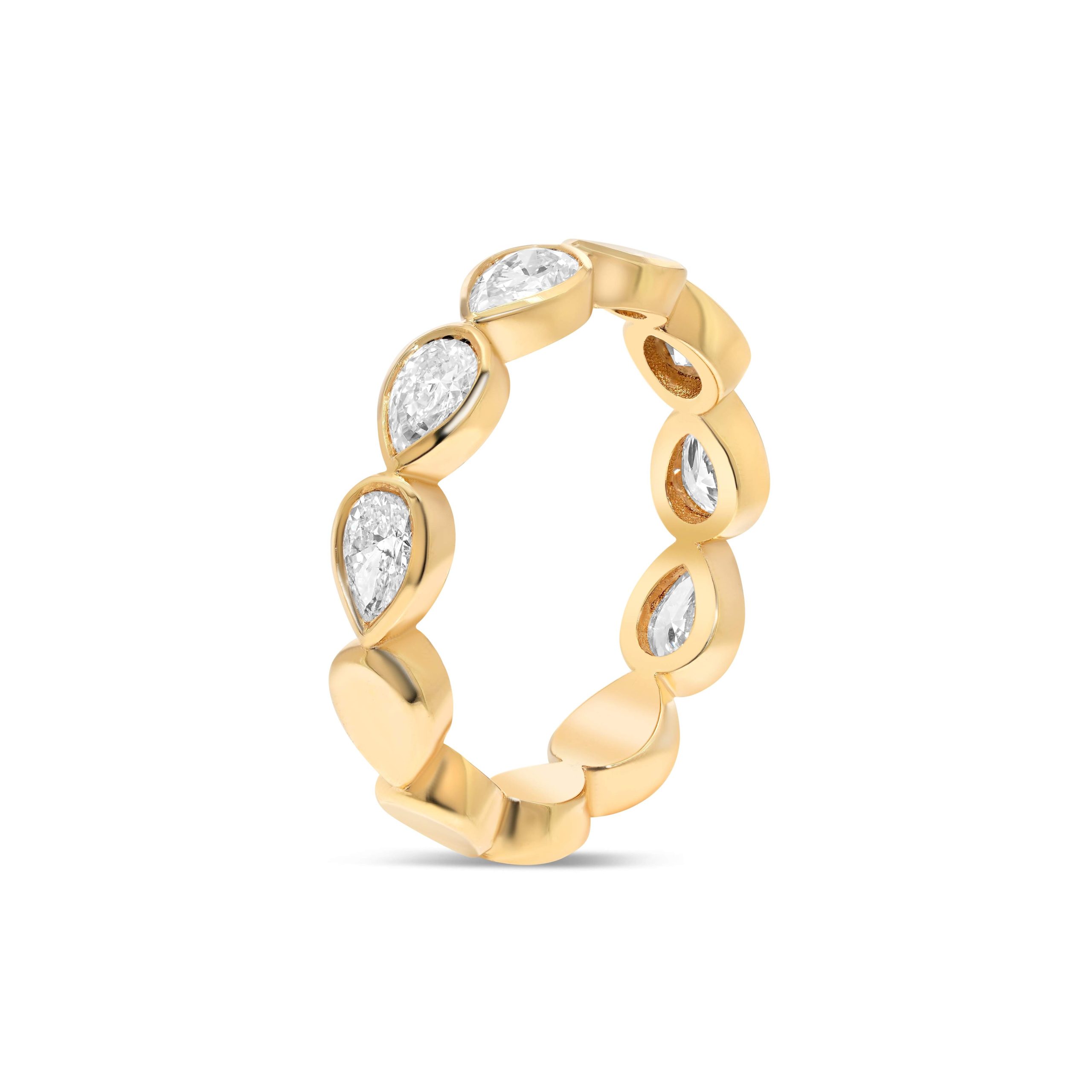 Discover sophistication redefined in our exquisite 18 karat yellow gold diamond band. This remarkable piece embodies elegance with its array of 1.30cts. of bezel set pear shaped diamonds. Each diamond is meticulously placed to accentuate the band’s timeless beauty, creating a mesmerizing harmony between the luminous 18 karat yellow gold and the brilliance of the pear shaped diamonds. Elevate any occasion with this stunning band, a symbol of grace, luxury, and everlasting style.