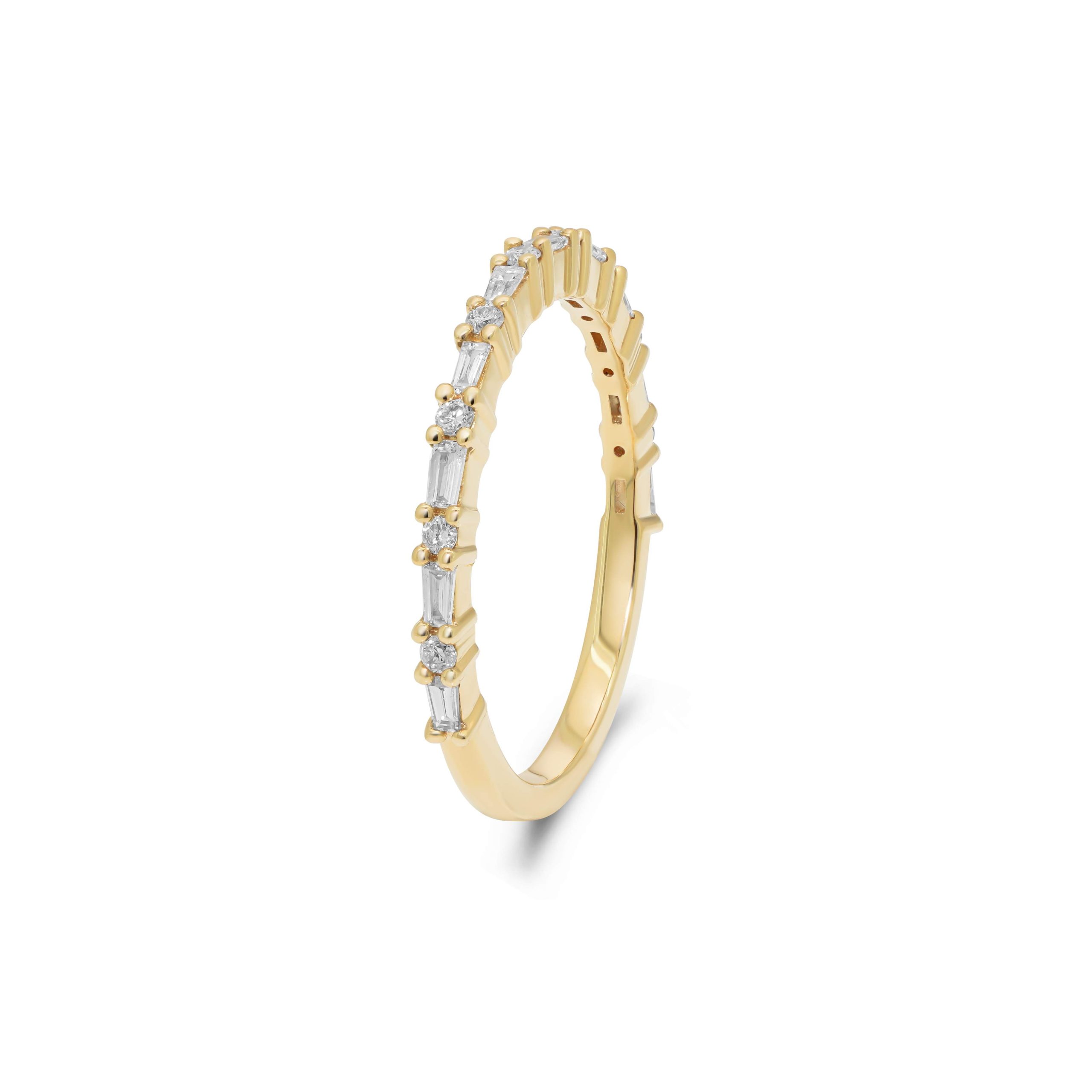 Discover refined elegance with our 18 karat yellow gold diamond band, a perfect blend of classic and contemporary design. This exquisite band features a harmonious arrangement of baguette and round brilliant cut diamonds, totaling 0.18cts. and 0.09cts. respectively. Each diamond is meticulously set in a secure prong setting, alternating between baguette and round cuts to create a stunning visual effect. Crafted with precision and attention to detail, this band exudes sophistication and timeless charm. Elevate your jewelry collection with the graceful allure of this radiant diamond band, ideal for any occasion.