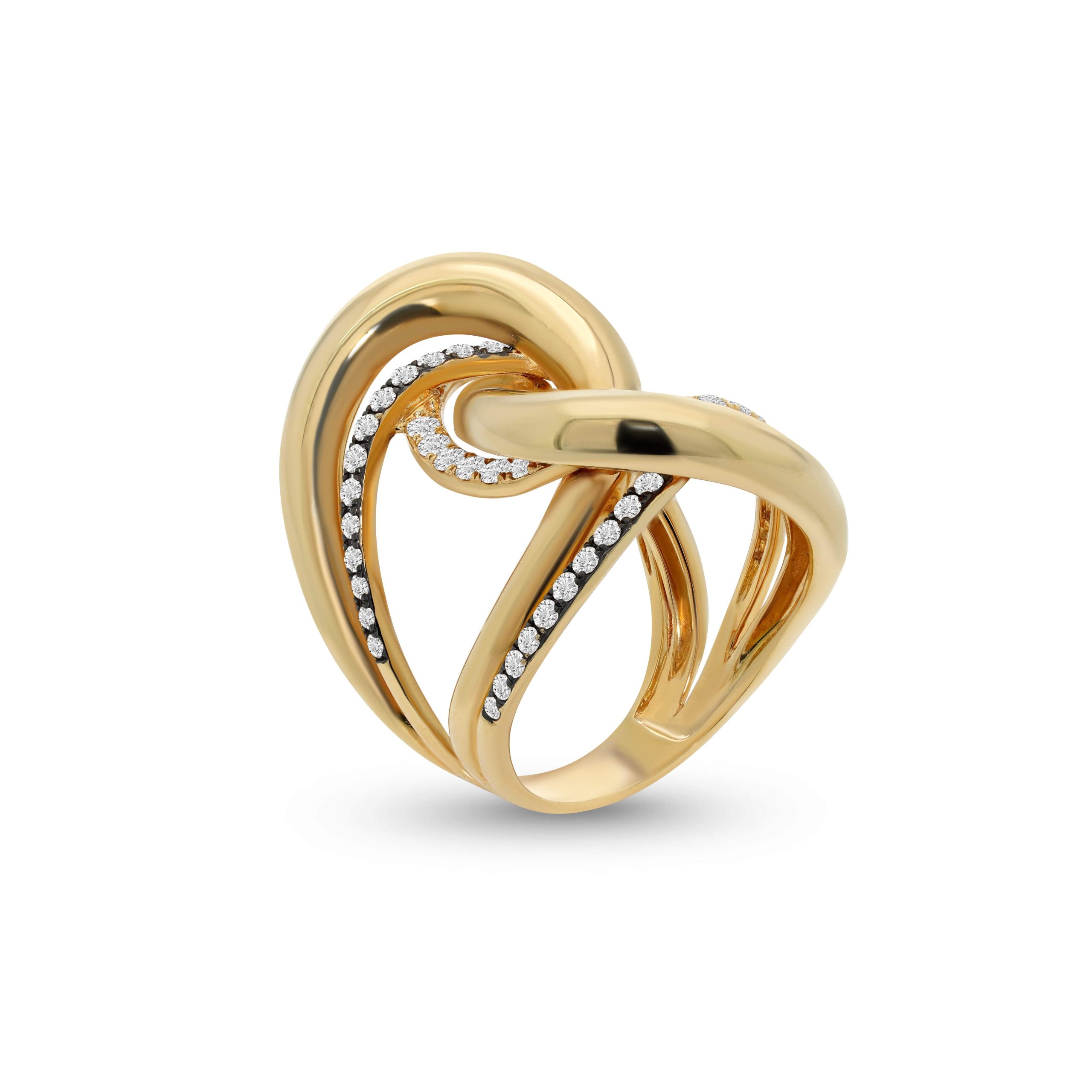 Unveil the epitome of elegance with our captivating 18 karat yellow gold interwoven diamond cocktail ring. This unique piece features a seamless interplay of .53cts. of scintillating white round brilliant cut diamonds interlaced with .53cts. of exquisite champagne colored round brilliant cut diamonds. The intertwining design creates a mesmerizing blend of sophistication and charm, accentuated by the warm embrace of yellow gold. Elevate any occasion with this distinctive ring, a true statement of refined luxury and timeless allure.