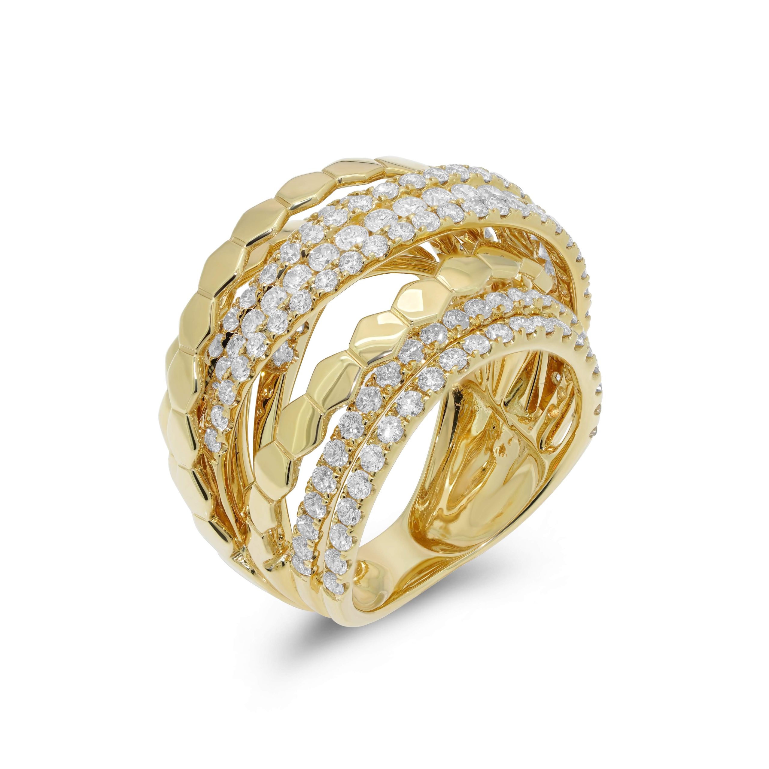 Indulge in opulence with our 18 karat yellow gold diamond cocktail ring, a breathtaking piece that embodies luxury and sophistication. This stunning ring features 2.55cts. of dazzling round brilliant cut diamonds, expertly set in a unique crisscross design. The alternating layers of radiant diamonds and gleaming gold create a captivating interplay of sparkle and shine. Meticulously crafted with exceptional attention to detail, this cocktail ring is perfect for making a statement at any special occasion. Elevate your jewelry collection with the timeless elegance and extraordinary brilliance of this exquisite diamond cocktail ring.