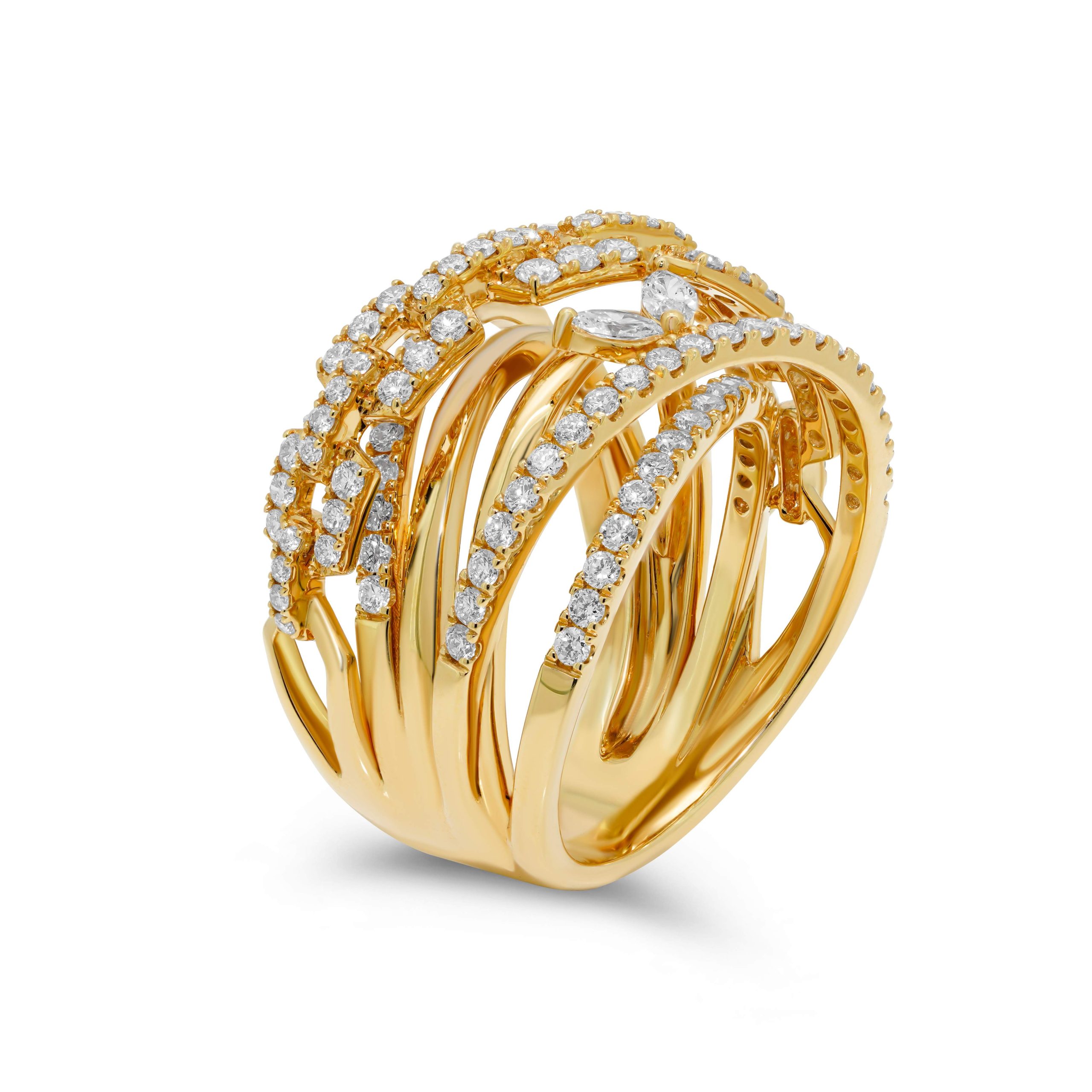 Elevate your style with our luxurious 18 karat yellow gold diamond cocktail ring, a stunning showcase of elegance and craftsmanship. This exquisite ring features 1.27cts. of radiant round brilliant cut diamonds and 0.12cts. of unique marquise cut diamonds. The crisscross design is beautifully highlighted by a central diamond link, angled to create a captivating focal point. Surrounding this centerpiece, layers of single row diamonds crisscross on either side, adding a dazzling brilliance and depth to the design. Perfect for special occasions or adding a touch of glamour to your everyday look, this cocktail ring is a true testament to timeless beauty and sophistication.