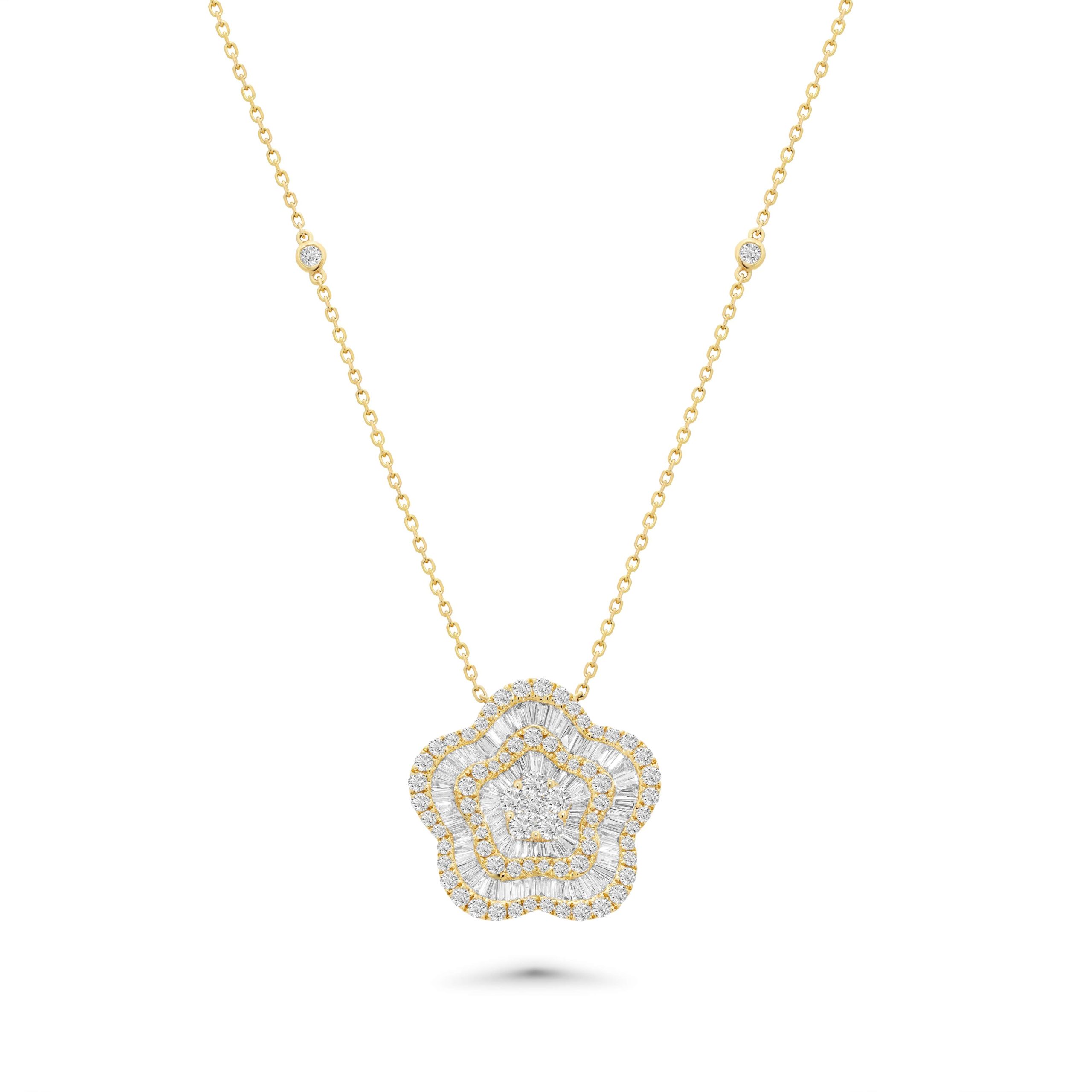 Experience the epitome of sophistication with our stunning 18 karat yellow gold diamond pendant and chain, an exquisite blend of elegance and luxury. This captivating piece features a breathtaking cluster design adorned with a radiant display of round brilliant cut and baguette cut diamonds. Sparkling round brilliant cut diamonds, totaling 0.89cts., illuminate the center of the cluster with unparalleled brilliance, while the sleek lines of baguette-cut diamonds, totaling 0.71cts., add a touch of modern flair. The lustrous yellow gold setting enhances the warmth and radiance of each diamond, creating a mesmerizing sparkle that captivates the eye. Suspended from a delicate chain, adorned with small round brilliant cut diamonds set spaciously throughout, this pendant exudes timeless elegance and charm, making it the perfect statement piece for any occasion.
