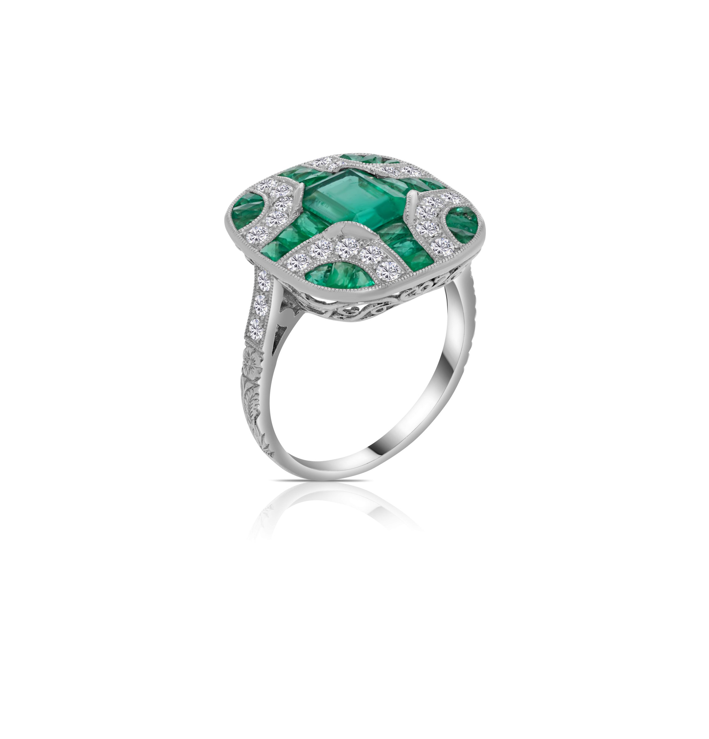 Introducing our exquisite Platinum Estate-Inspired Emerald and Diamond Ring, a striking fusion of vintage allure with a modern touch. This exceptional ring features 2.31cts. of emeralds, reminiscent of a bygone era, accompanied by 0.50cts. of round brilliant cut diamonds, meticulously set in a modern design. The platinum setting enhances the captivating beauty of the emeralds, exuding a sense of timeless elegance while the surrounding diamonds add a contemporary sparkle. Whether worn as a statement piece for a special event or to add a touch of vintage sophistication to your everyday look, this ring is the ideal choice. Experience the charm of this estate-inspired ring, boasting the richness of natural emeralds and the brilliance of diamonds, for a truly unique and elegant addition to your collection.