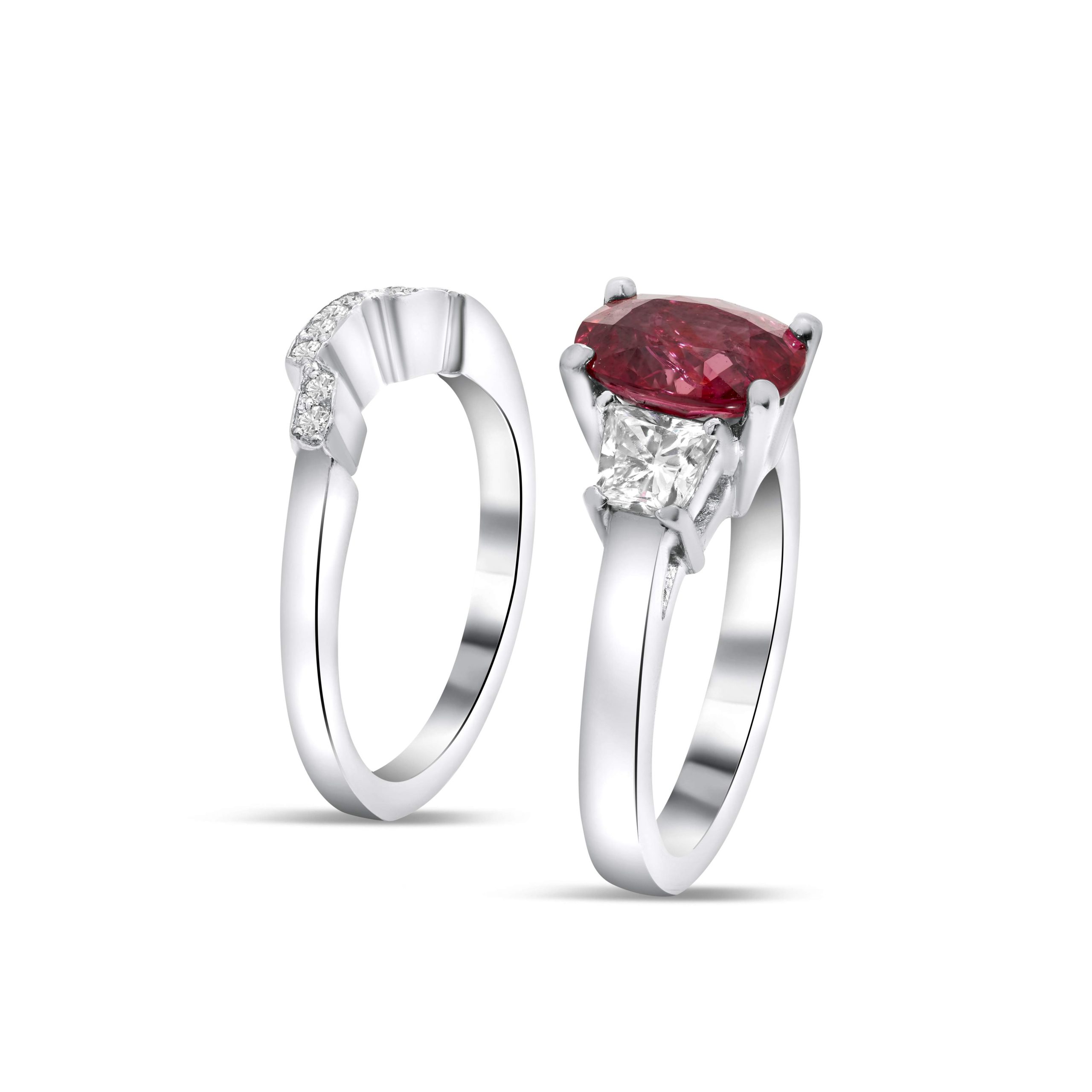 Step into a world of eternal love and exquisite craftsmanship with our platinum two piece engagement ring set. The engagement ring features a magnificent 2.07ct. oval shaped ruby, exuding passion and romance at its heart. Flanking this vibrant ruby are two trapezoid cut diamonds, each weighing .36cts., adding a mesmerizing symmetrical allure to the ring. The elegance doesn’t end there–the matching band, intricately curved to complement the engagement ring, features .08cts. of round brilliant cut diamonds, accentuating the beauty of the ensemble. Crafted with meticulous attention to detail, this set is a celebration of love and commitment, showcasing the allure of a vibrant ruby embraced by the timeless brilliance of diamonds. Embark on your journey of love with this exceptional ring set, a symbol of everlasting devotion and refined elegance.